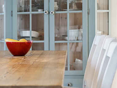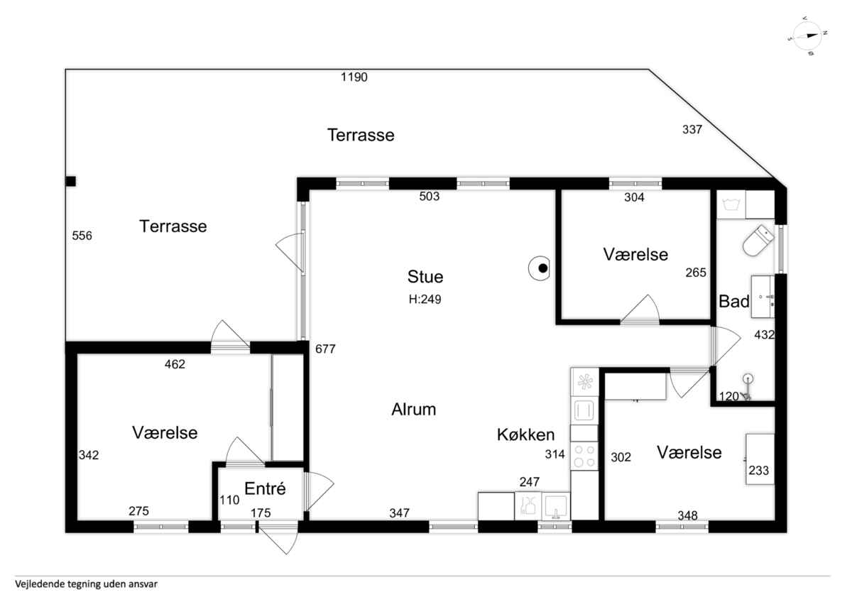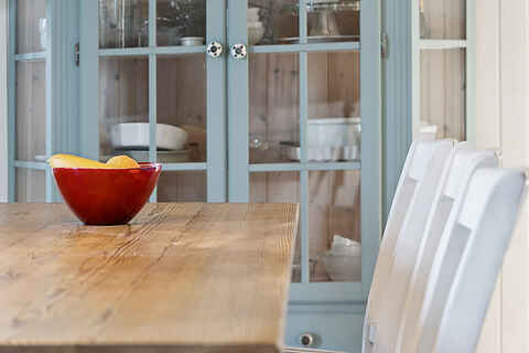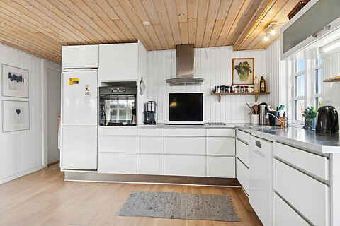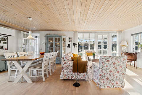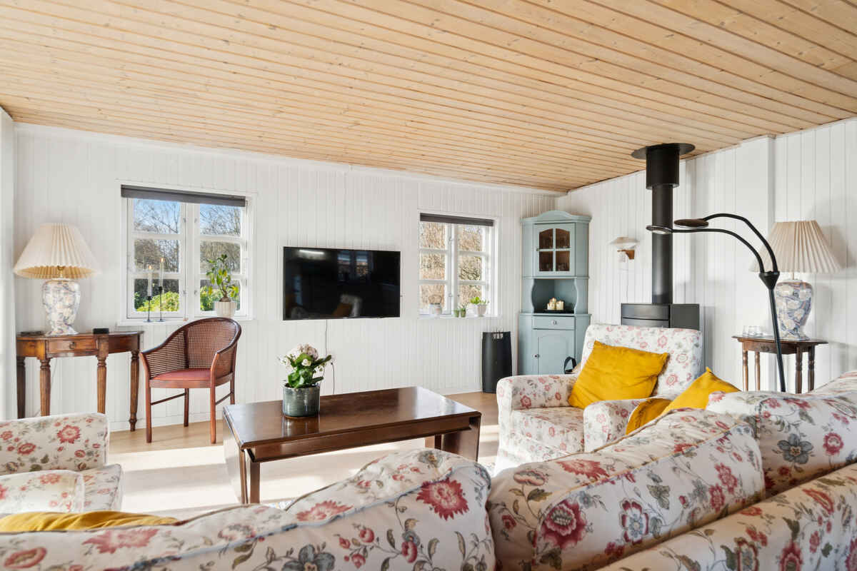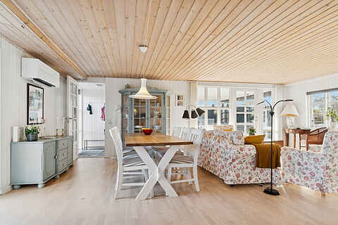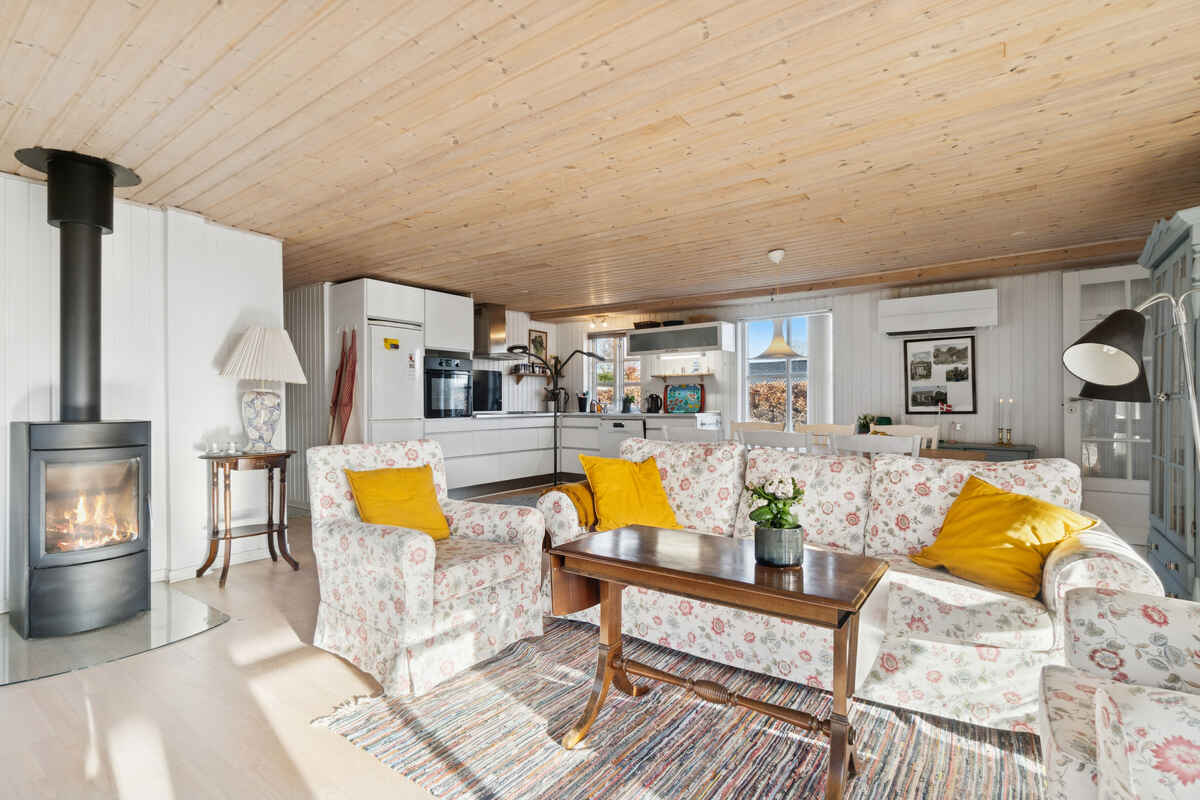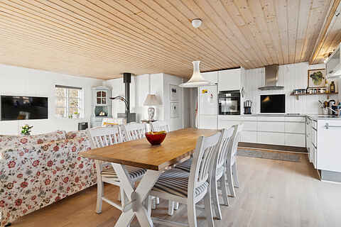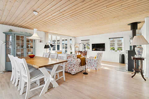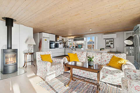 Det klassiske sommerhus på 90 m² giver en rolig ramme om ferien. Det hyggelige køkkenalrum samler alle til måltider og samvær, mens sofasektionen indbyder til afslapning foran brændeovnen på kølige dage. Indretningen er enkel, lys og rar at opholde sig i.