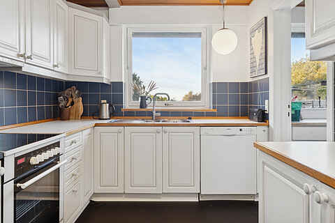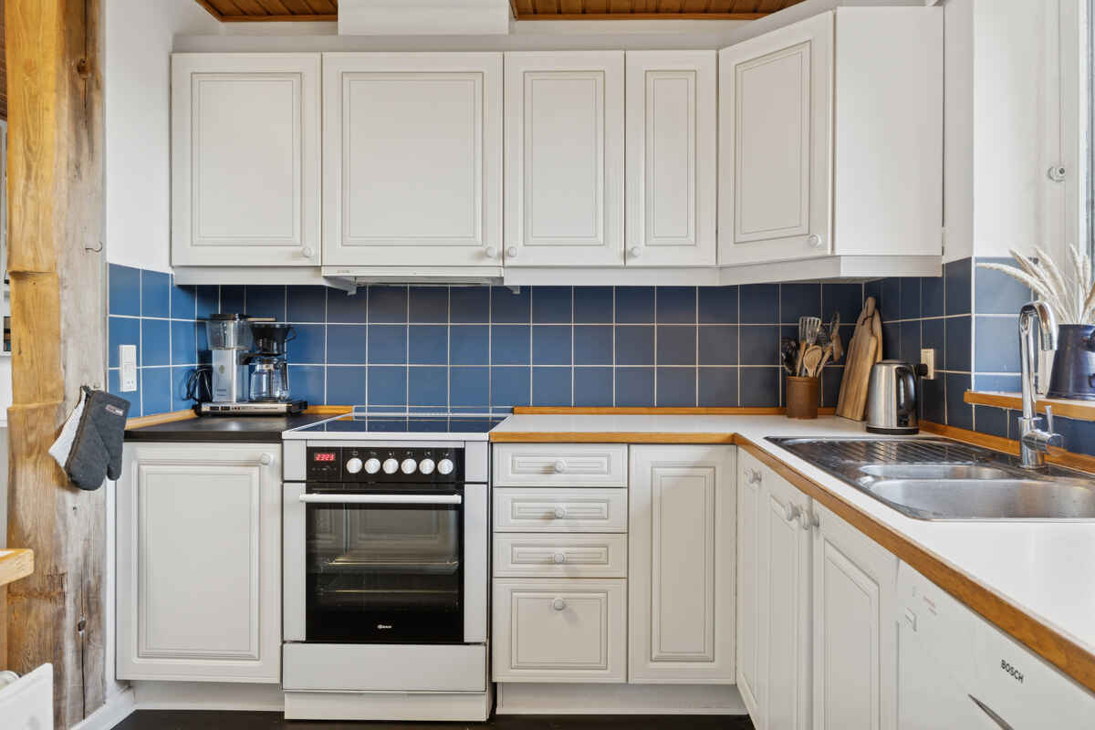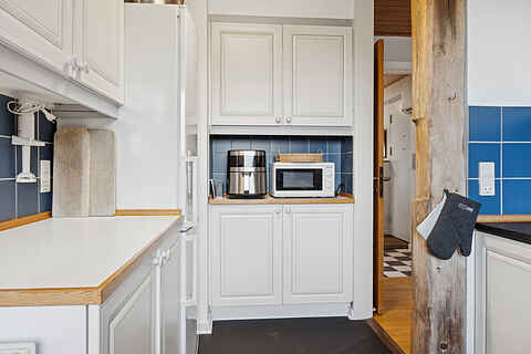 Køkkenet er udstyret med 1 køleskab med 50l fryser, der er 4 keramiske kogeplader, varmluftovn, mikrobølgeovn, airfryer, samt opvaskemaskine.