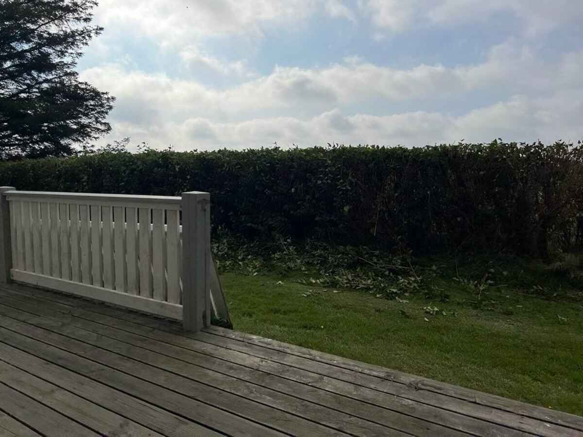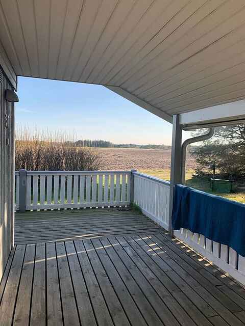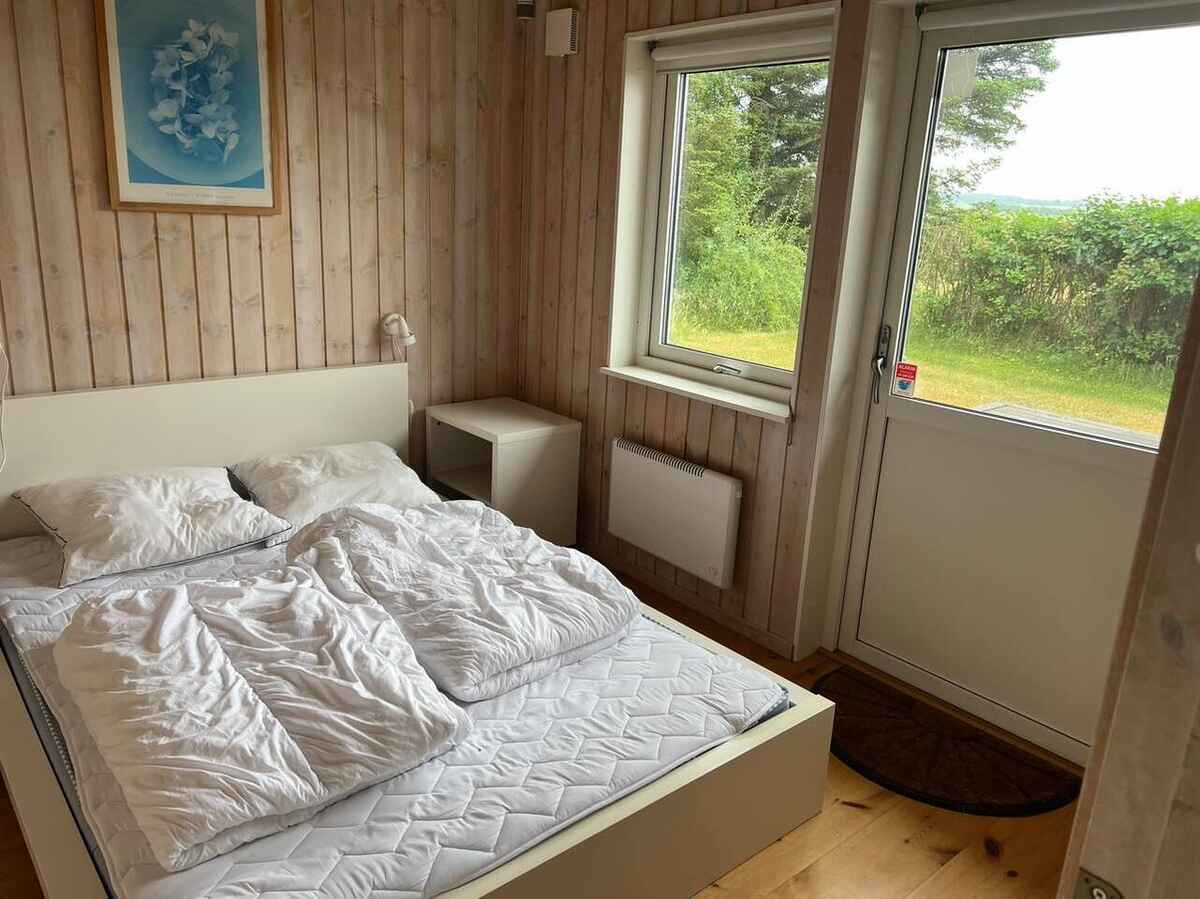 Grunden er omkranset af høje træer. Der er en stor, dejlig træterrasse med havemøbler og liggestole, og hvis vejret ikke viser sig fra sin bedste side, er der en overdækket terrasse med en bænk, så I alligevel kan være ude og nyde den skønne udsigt og den friske luft.