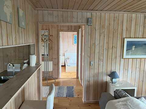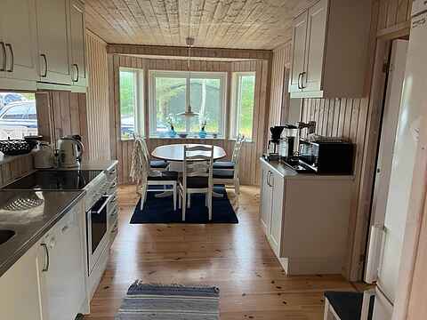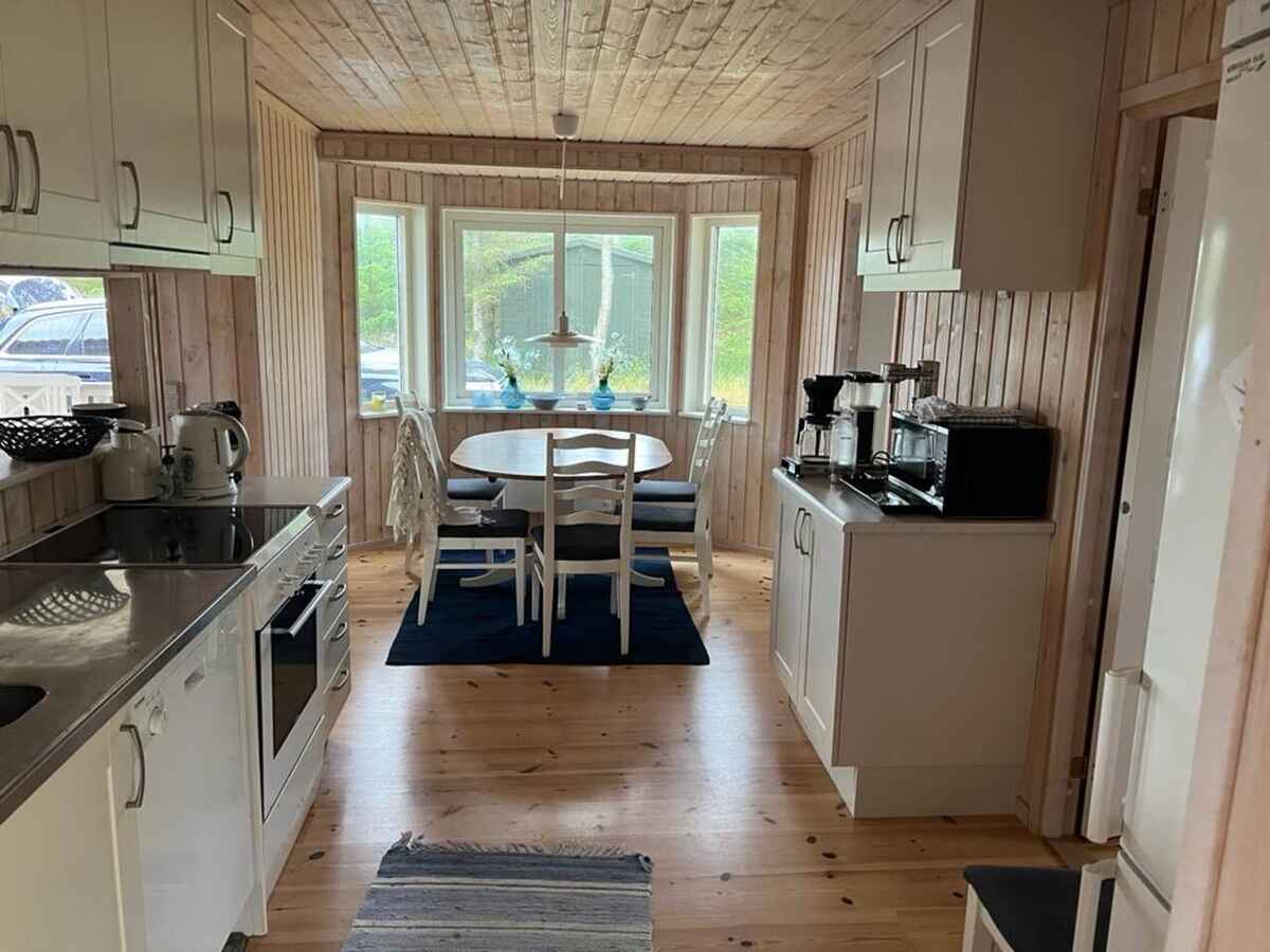 Her er en hyggelig stue med TV med danske og tyske kanaler. Det veludstyrede køkken med bl.a. opvaskemaskine og mikroovn ligger i åben forbindelse med stuen og den dejlige spiseplads.