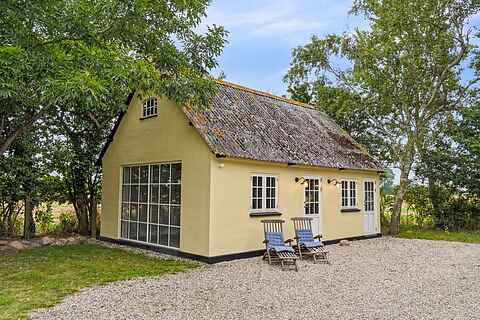 Huset rummer et lyst køkken-alrum med en hyggelig stue samt et rummeligt soveværelse med dobbeltseng og direkte udgang til haven.