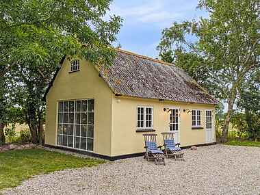 Huset rummer et lyst køkken-alrum med en hyggelig stue samt et rummeligt soveværelse med dobbeltseng og direkte udgang til haven.