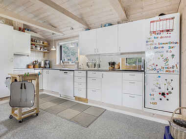 Blot 300 meter væk venter en børnevenlig strand med en indbydende badebro. Dette er et paradis for de yngste, der kan lege i sandet og bygge sandslotte, mens de voksne nyder afslappende stunder med ro i sindet. I haven vil du finde et legende paradis med et legehus, gynge, rutschebane og sandkasse til de mindste, samt rigelig plads til solbadning og udendørs aktiviteter. Aftenerne kan nydes omkring bålstedet eller på den delvist overdækkede terrasse, der giver dig privatlivets luksus. For udendørs underholdning er der også en række spil til rådighed.