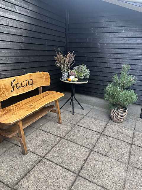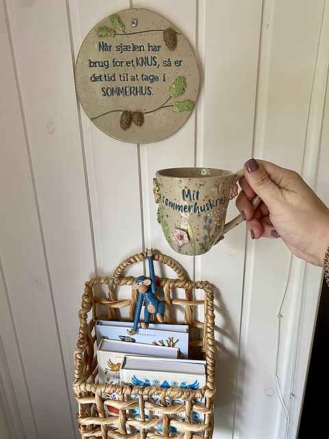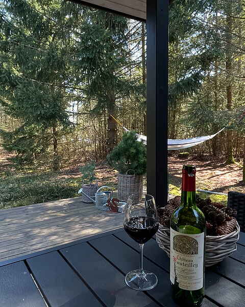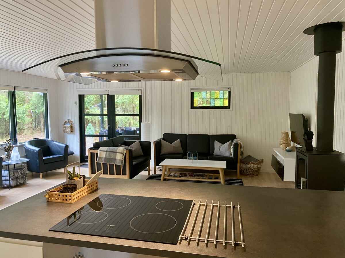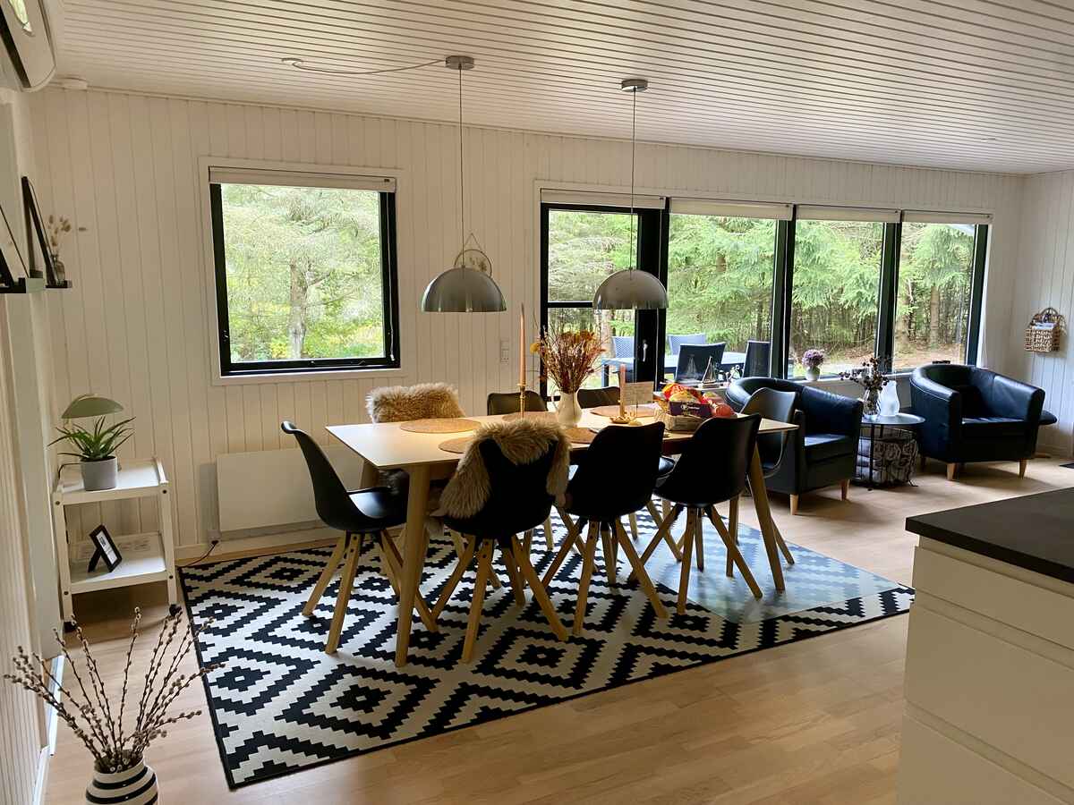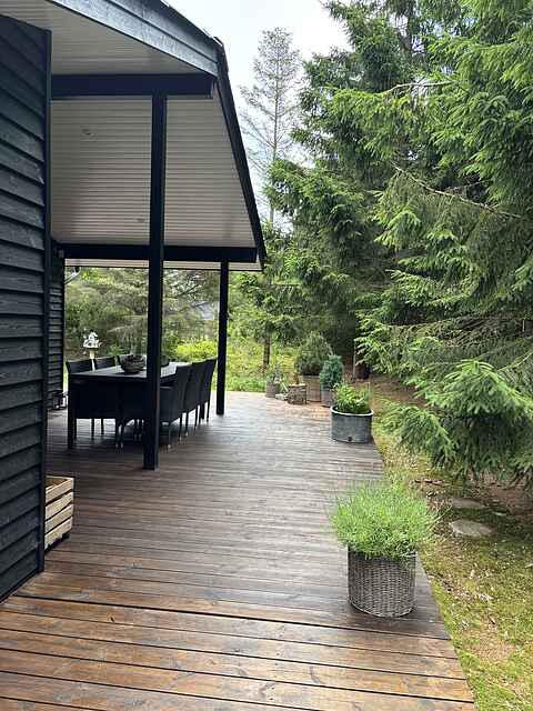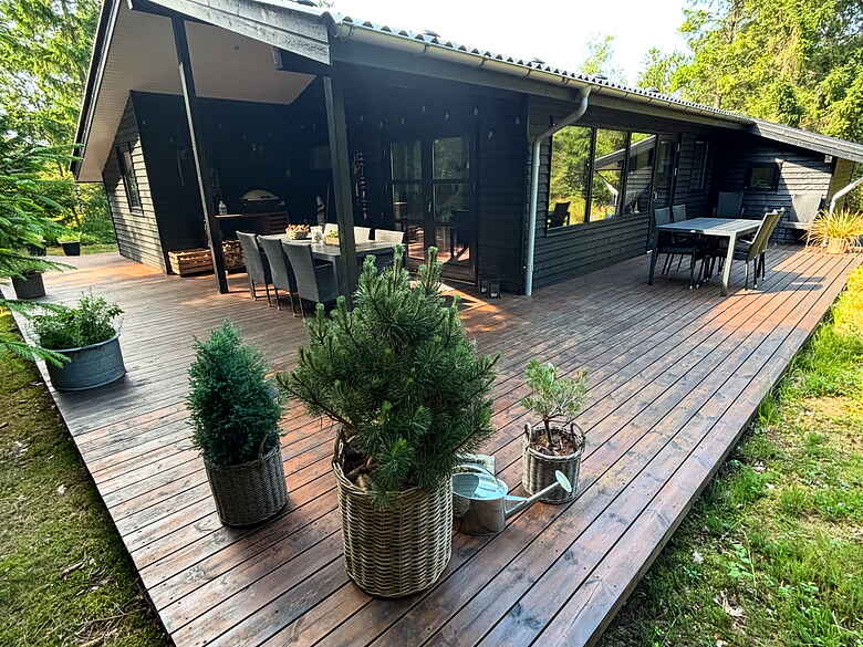 Sommerhuset ligger på en helt ugeneret naturgrund omgivet af høje fyrretræer. Her er der fred og privatliv, og dagene starter ofte med fuglesang og mulighed for at følge dyrelivet helt tæt på. Indretningen er funktionel og skabt til afslappende feriedage sammen.