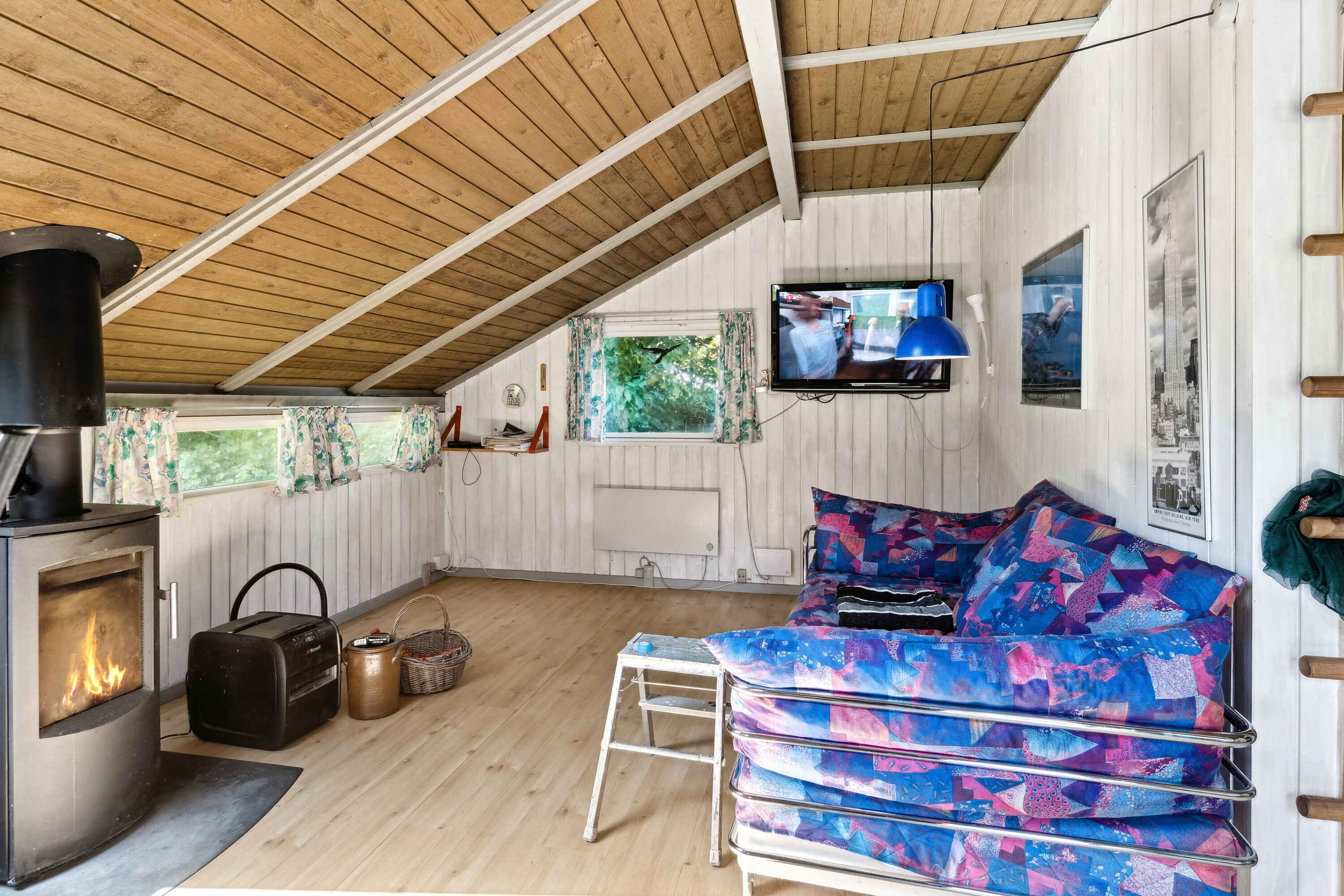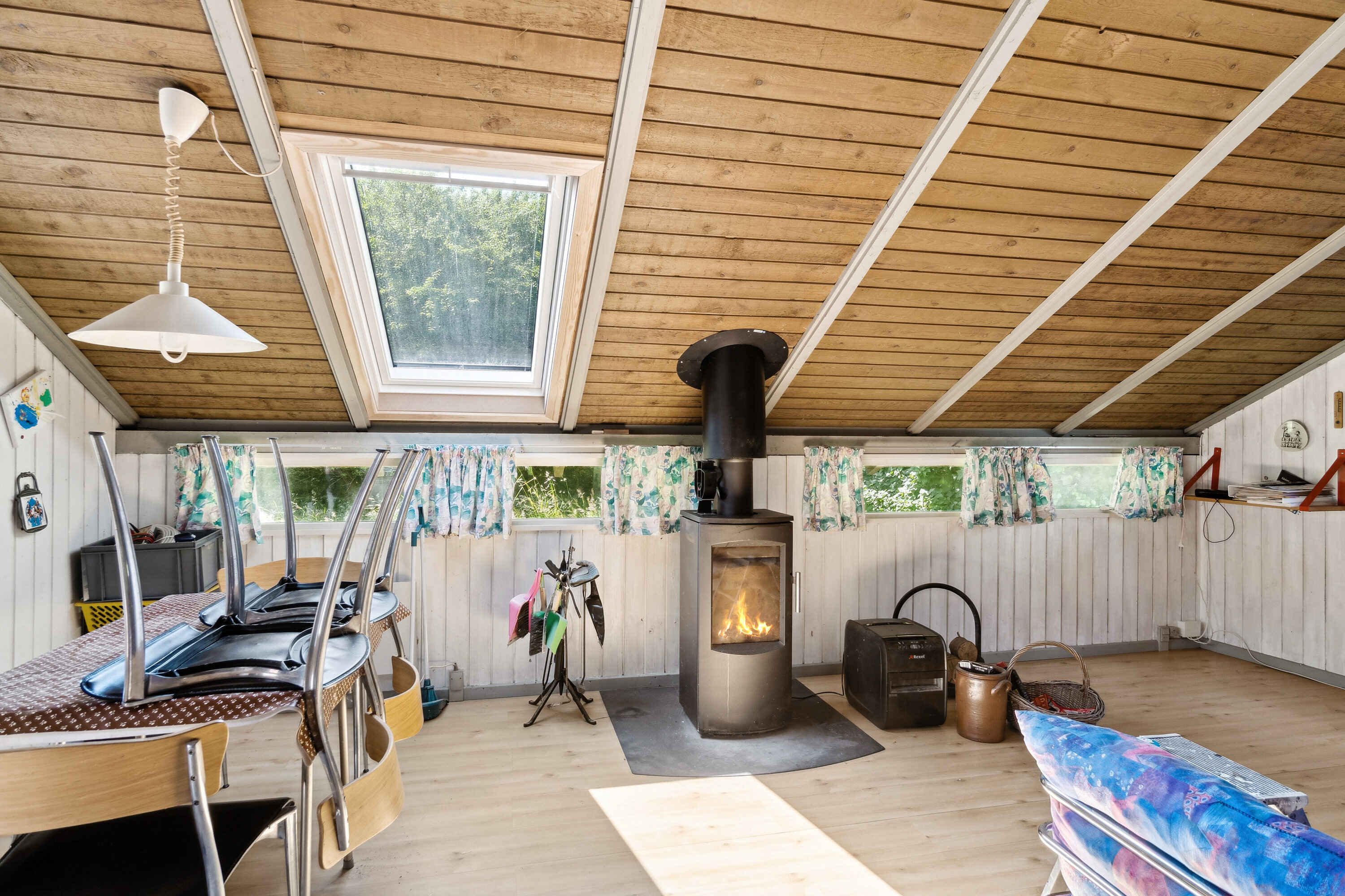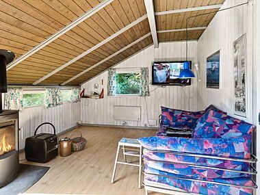 Indenfor byder stuen på brændeovn, tv og brætspil. Det er et naturligt samlingspunkt efter turene udendørs, og rummene er indrettet, så I hurtigt falder til og får ro på.