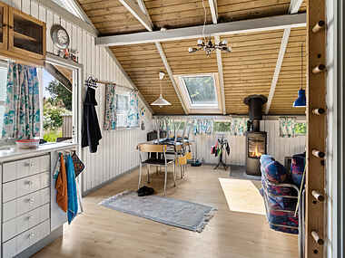 Indenfor byder stuen på brændeovn, tv og brætspil. Det er et naturligt samlingspunkt efter turene udendørs, og rummene er indrettet, så I hurtigt falder til og får ro på.