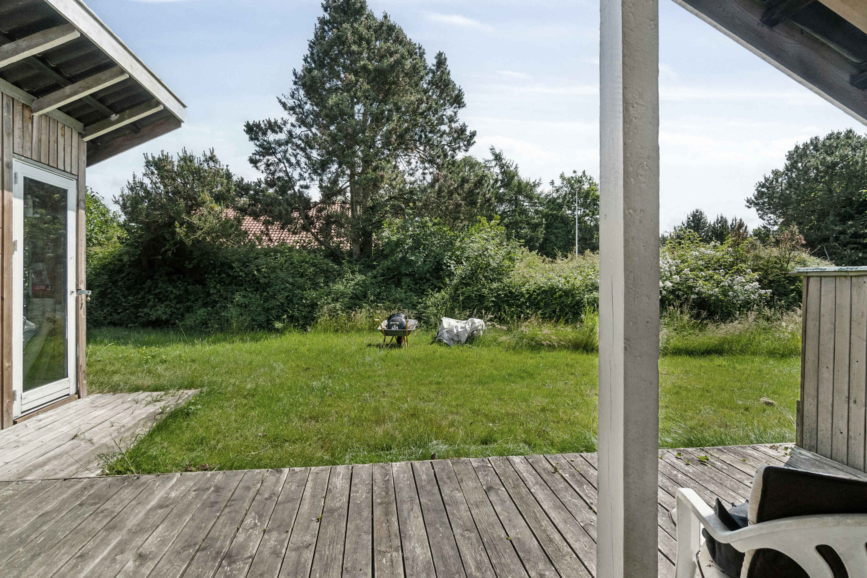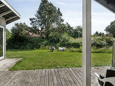 Huset ligger højt på en bakke i et roligt sommerhusområde, hvor udsigten over landskabet giver en særlig ro. Den korte gåtur ned til stranden via trappe gør det let at starte dagen med en dukkert eller en stille stund ved vandet.