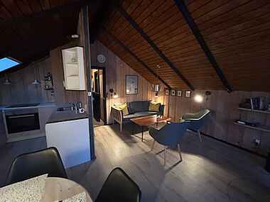 Opholdsstuen med åbent køkken er husets samlingspunkt, hvor I kan lave mad, slappe af og være sammen. Planløsningen gør det nemt at holde ferie i et tempo, der passer jer, uanset om I er ude hele dagen eller nyder roen hjemme.
