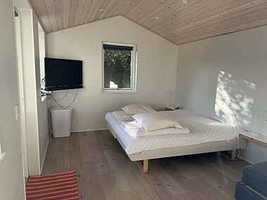 Huset indeholder desuden tre fine værelser samt et pænt badeværelse. Det fjerde værelse ligger i tilbygningen, der støder ud til terrassen. I tilbygningen er der også et ekstra badeværelse med toilet og brusebad.