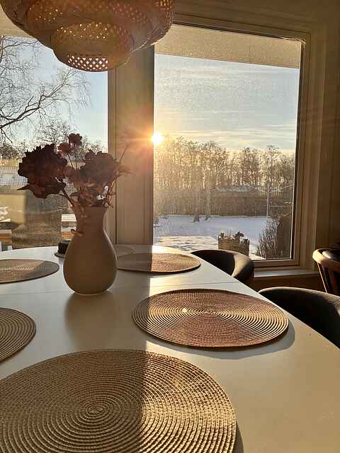 Udenfor finder I en stor, en lukket( trådhegn) have, ideel til leg for børn og tryg plads for hunden. Den store terrasse med gasgrill indbyder til fælles måltider og lange sommeraftener.