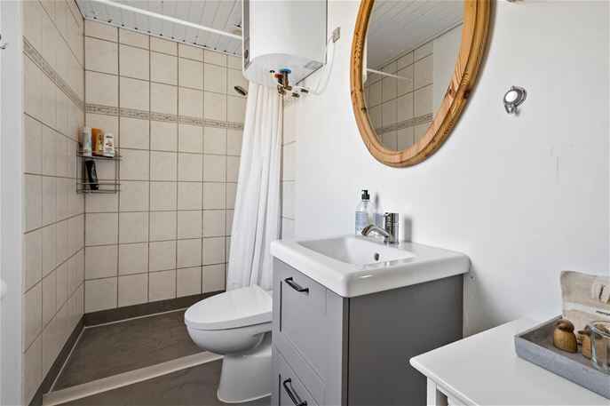 Huset har en perfekt beliggenhed på rolig vej, kun 250 meter fra stranden, hvor der findes købmand(selvbetjent døgnåbent) Pizzaria(sommer åbent) og ishus (sommer åbent)
