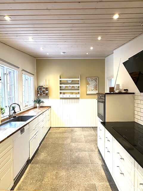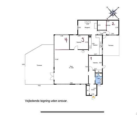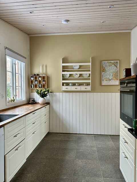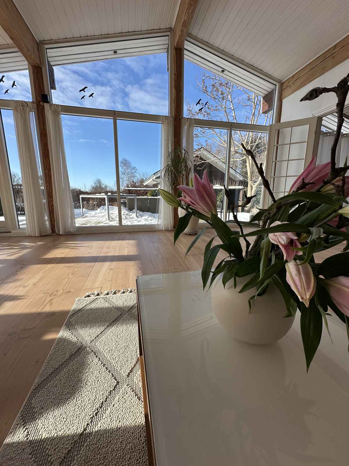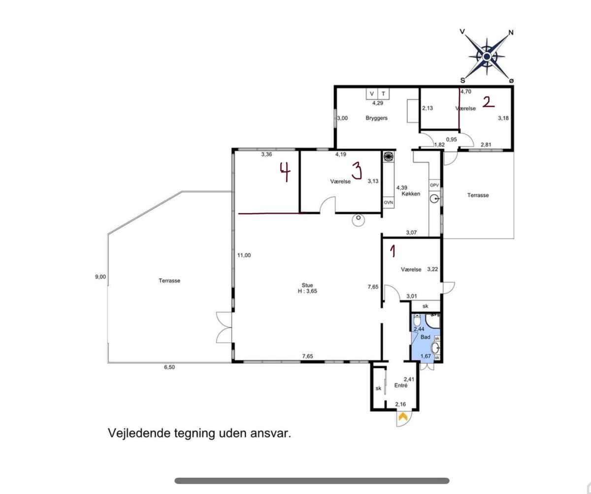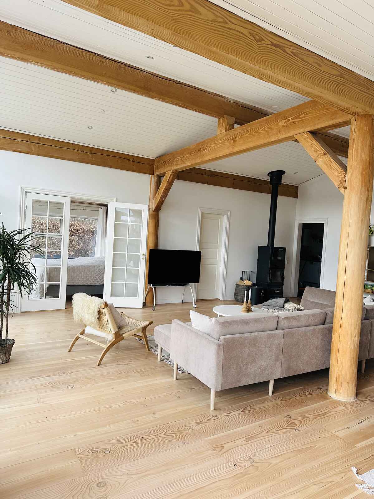 Indenfor venter et lyst opholdsmiljø, hvor køkken og stue ligger i åben forbindelse. Her er god plads til fælles madlavning, spil og roligere stunder. De fire værelser er praktisk fordelt, så alle får et privat hjørne at trække sig tilbage til.