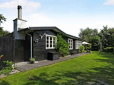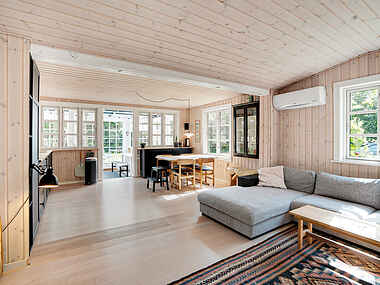 Klassisk dansk sommerhus i sort med hvidmalede bondehusvinduer, som indvendig er gennemgribende istandsat – inden for de seneste år – med respekt for husets identitet.