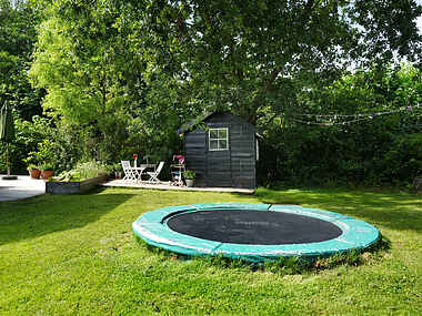 Til børnene er der gyngestativ, legehus og en nedgravet trampolin.
