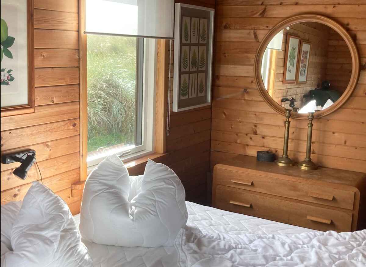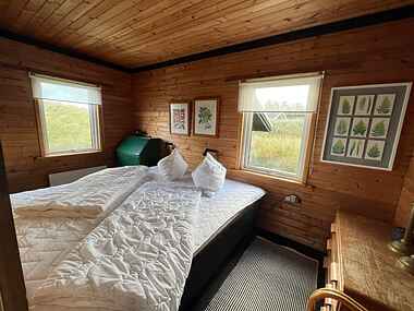 Huset har er et stort soveværelse med en dobbeltseng og et soveværelse med en dobbelt udtræksseng med to sovepladser og en sovesofa til en person i stuen.