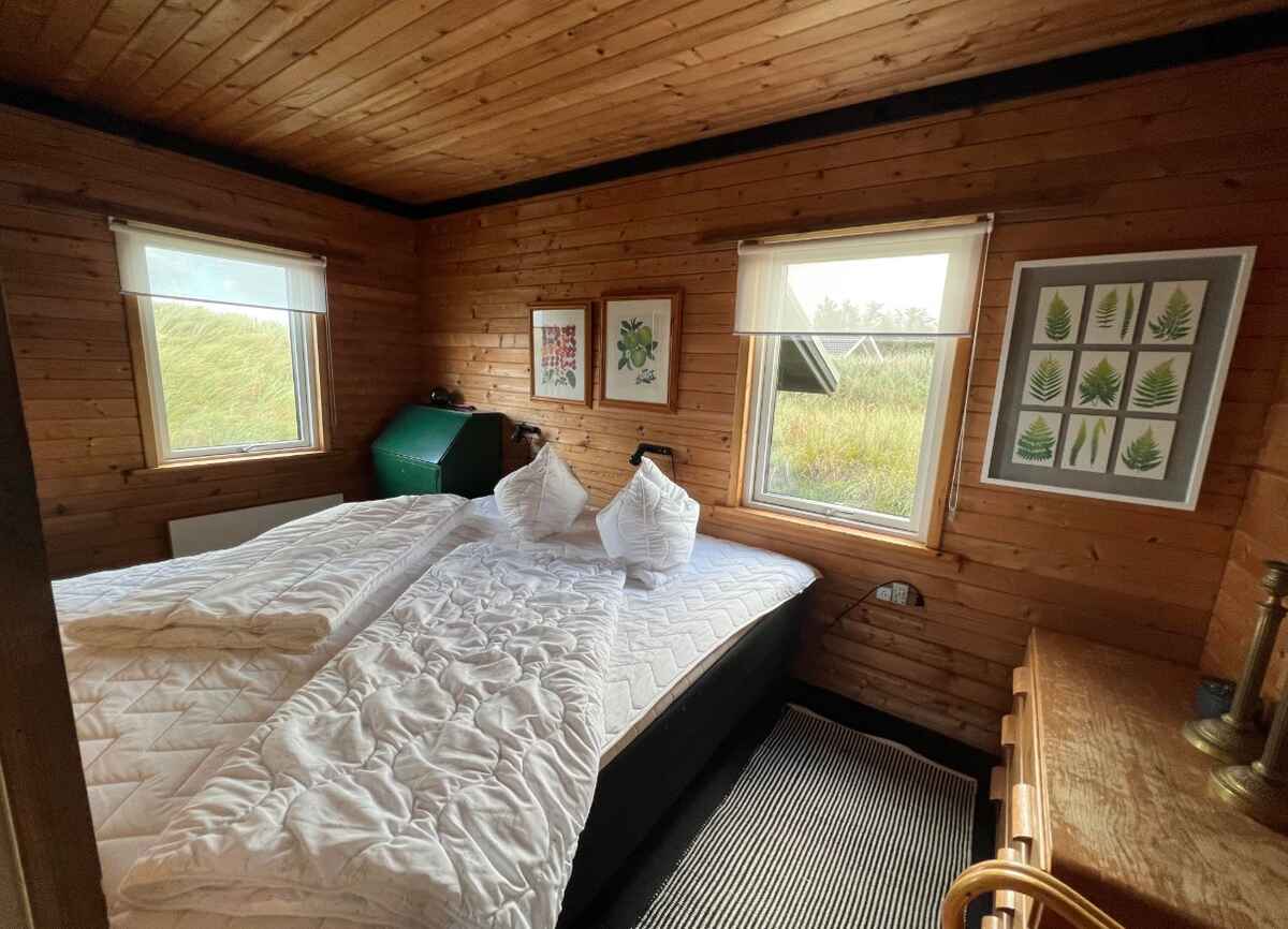Huset har er et stort soveværelse med en dobbeltseng og et soveværelse med en dobbelt udtræksseng med to sovepladser og en sovesofa til en person i stuen.