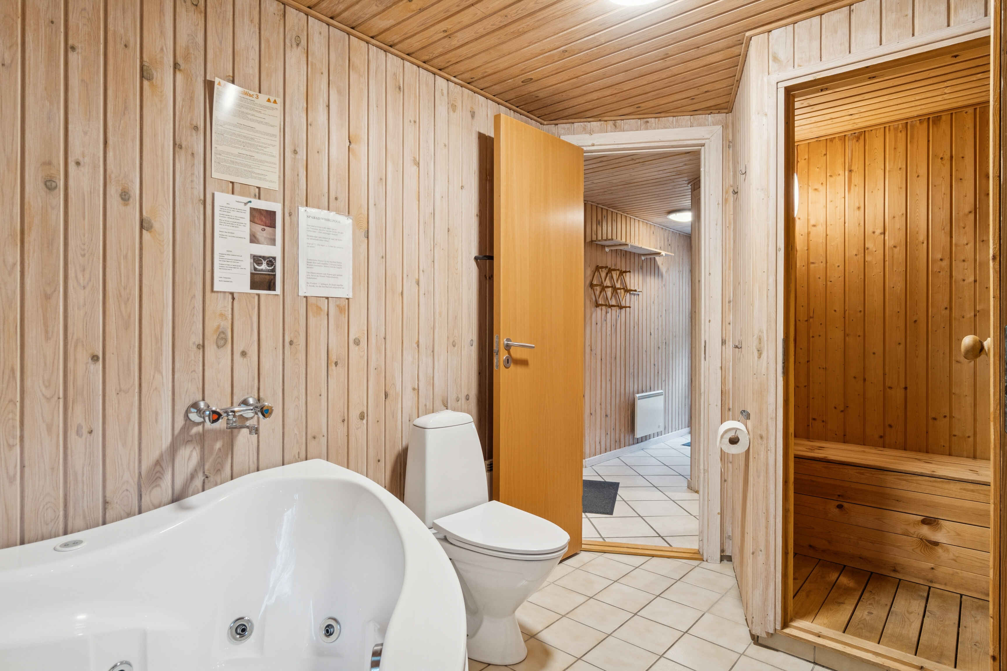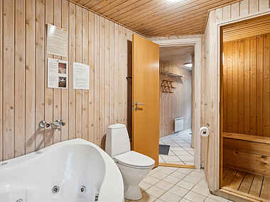 Efter en dag ude kan I tænde op i brændeovnen eller lade varmepumpen sikre et behageligt indeklima. Badeværelset byder på både gulvvarme, hjørnespa og sauna – oplagt til afslapning året rundt.