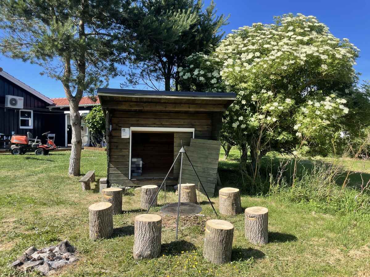 Super dejligt feriehus med spa kun ca. 100 meter fra vandet. Huset ligger på en dejlig stor grund. Vil I “ud i naturen” er her et shelter, så I kan prøve at sove under åben himmel. Her er gratis internet.