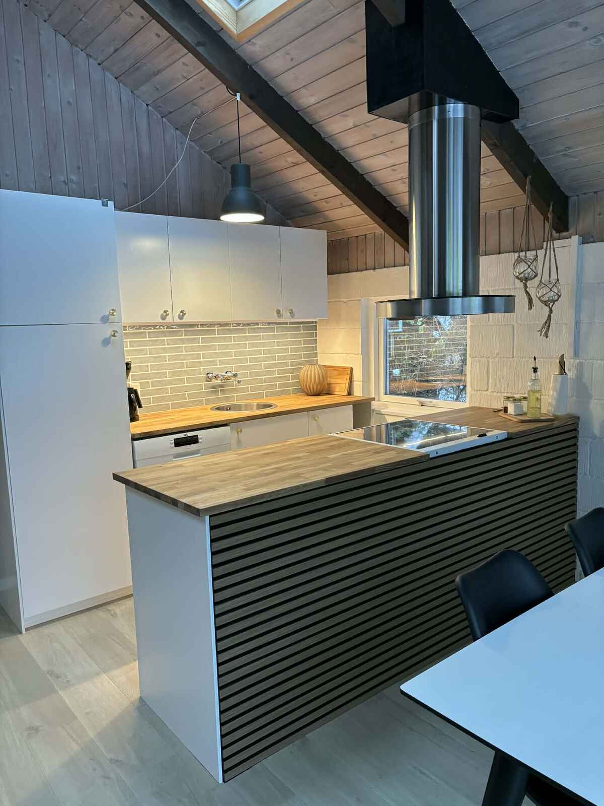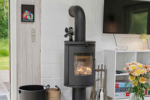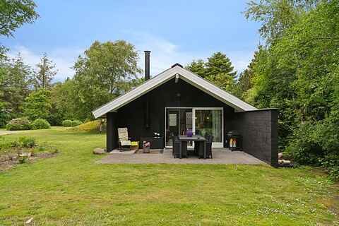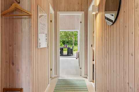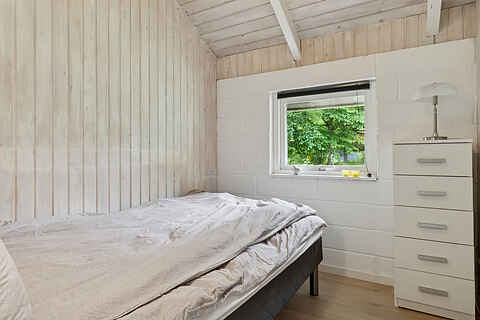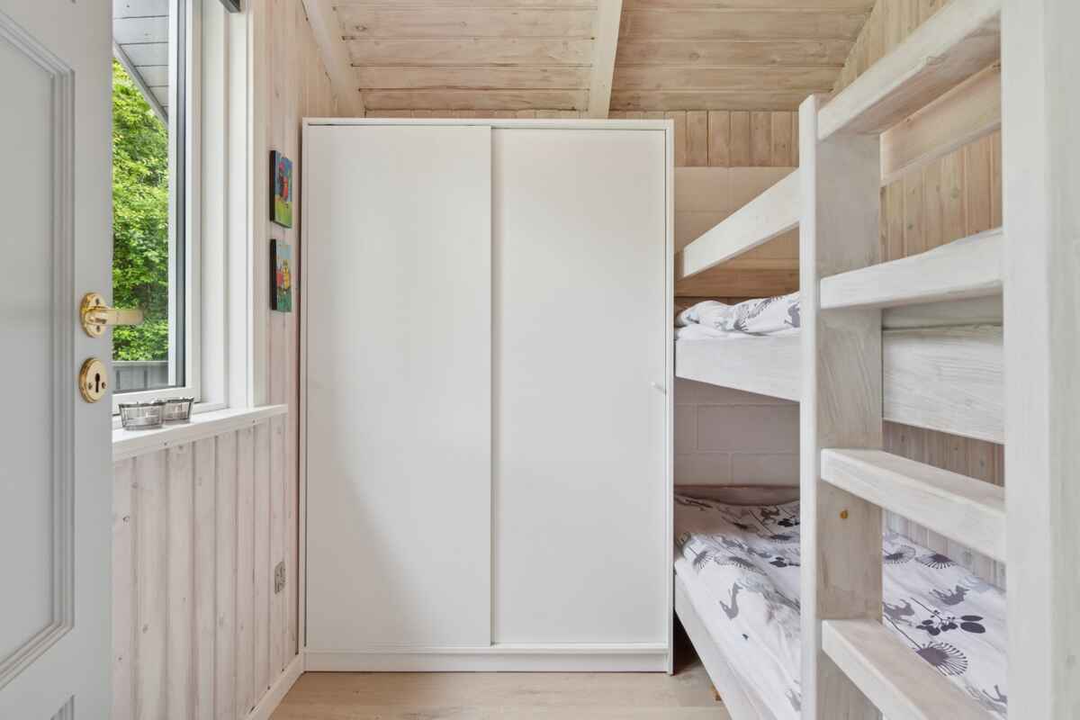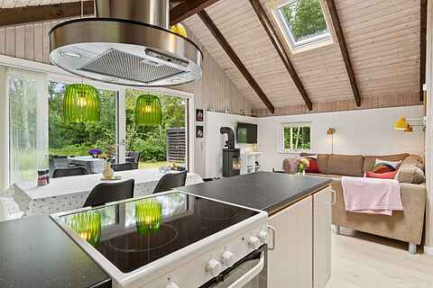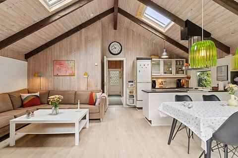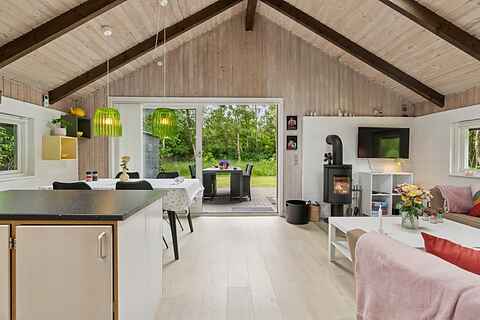 Her finder du et sommerhus, hvor roen straks indfinder sig. Tre soveværelser med plads til seks personer giver mulighed for både familietid og privatliv. Indenfor er atmosfæren varm og enkel, med brændeovn i stuen og et åbent køkken, der gør madlavningen til en fælles aktivitet.