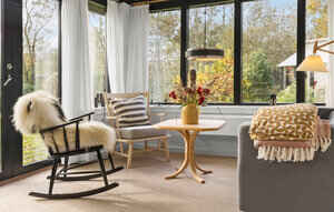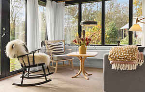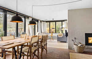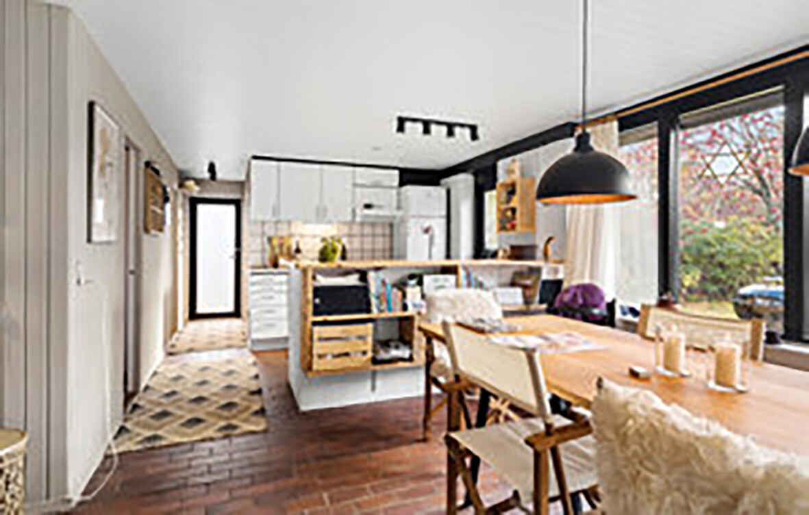 Køkken. Spisestue og stue er et stort rum og har store vinduer og døre ud mod haven/terrassen. Der er brændeovn med en røgsuger, der gør det nemt at tænde op. Der er trådløst internet, tv med chromecast og Sonos musikanlæg.