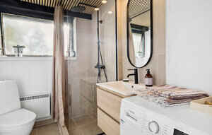 Der er et badeværelse med gulvvarme, bruser og vaskemaskine. Køkkenet har komfur med glaskeramisk kogeplade, varmluftovn med grill, der er køl/frys og alt hvad man kan tænkes at skulle bruge i et køkken af køkkenredskaber. Der er service, glas, bestik mm til 8 personer.
