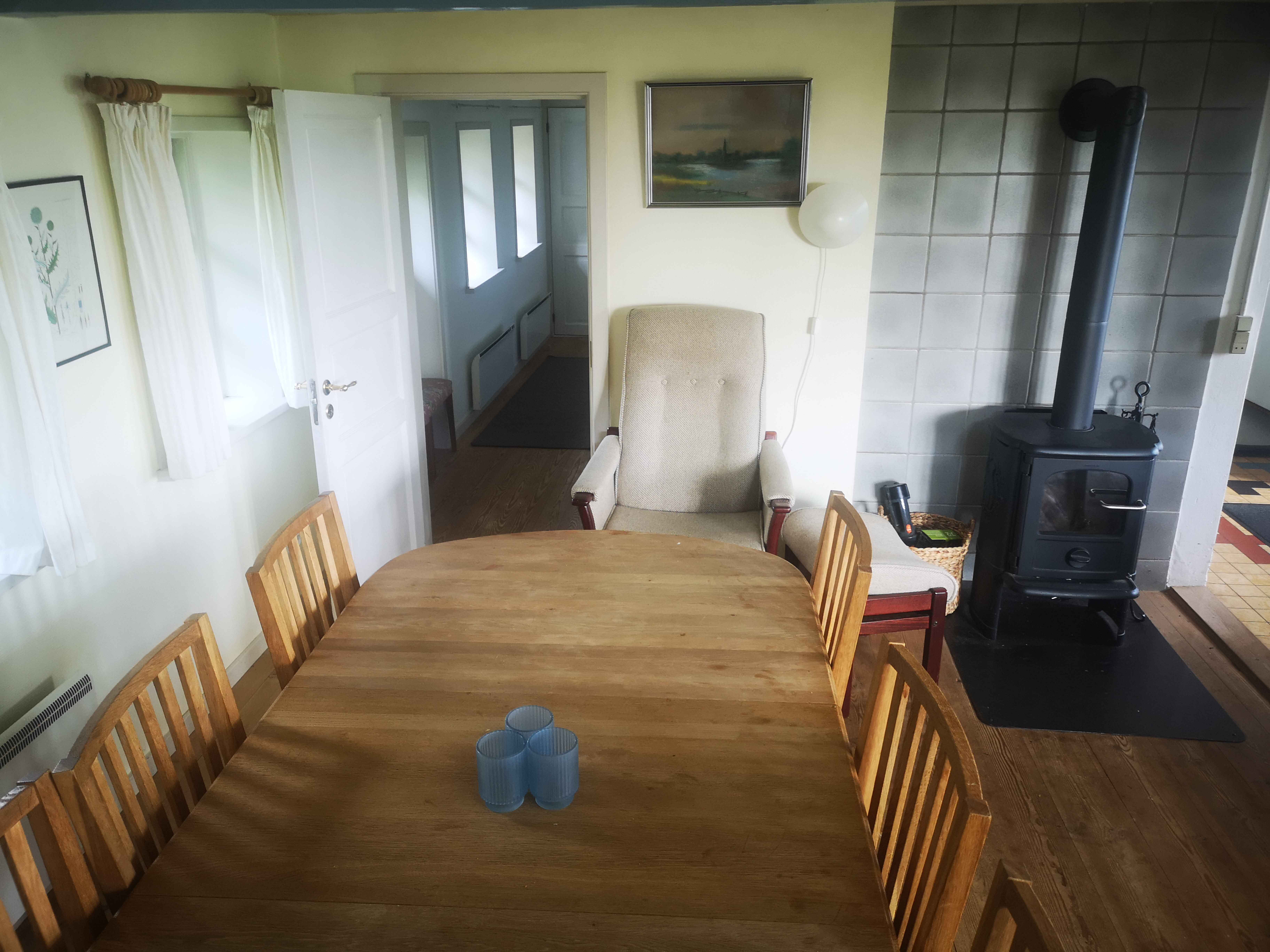 Huset er oprindelig opført i 1882 og er løbende renoveret. Der er både elvarme og varmepumpe, så huset kan varmes op året rundt. Stuen er hyggeligt indrettet med brændeovn. Der er fjernsyn med danske kanaler og Chromecast, så I kan se jeres ”egne kanaler”. Her er også en barnestol, hvis I har brug for det.