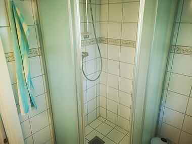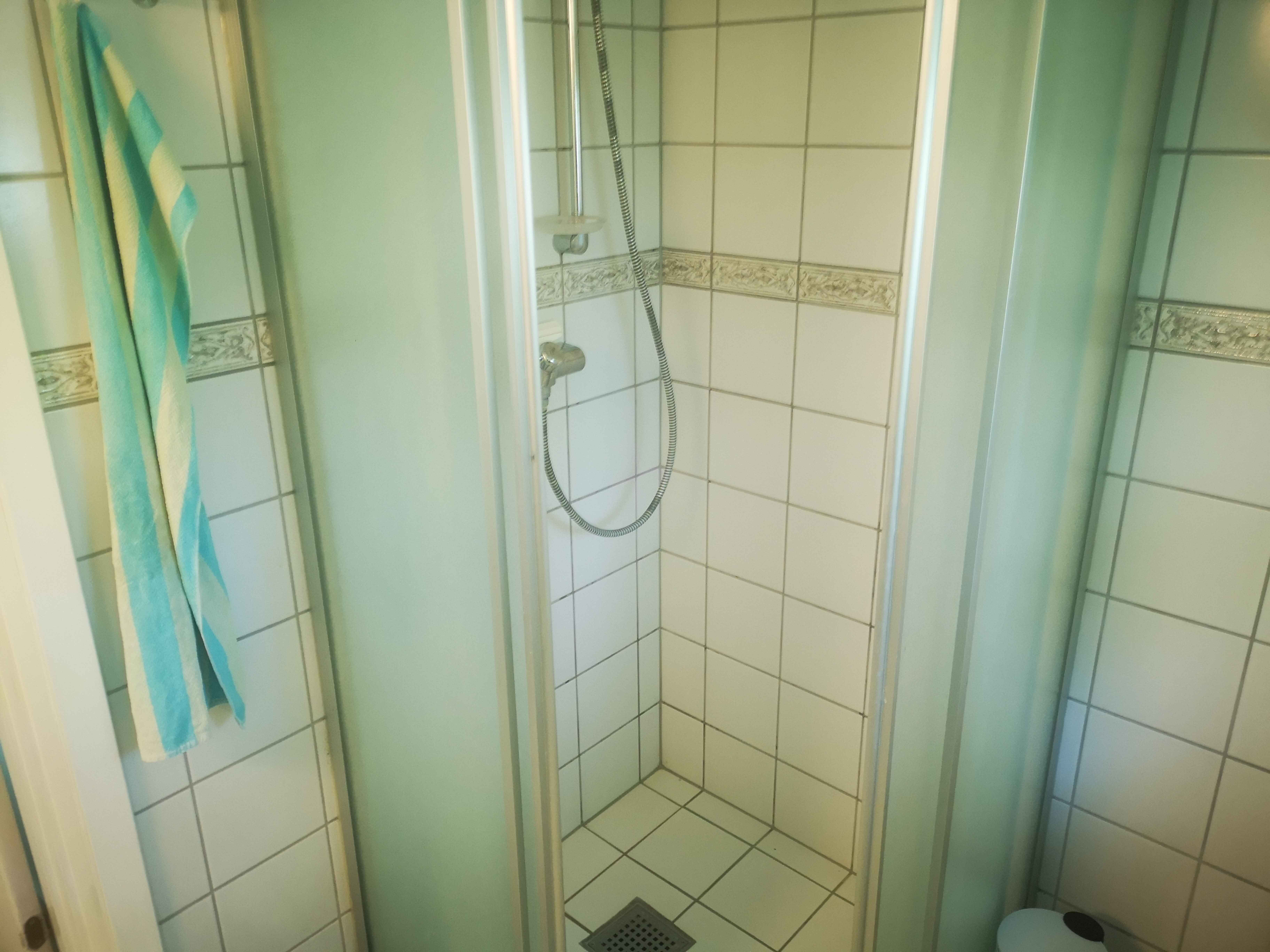Badeværelset er indrettet med brusebad, toilet og varme i gulvet. Her er også vaskemaskine.