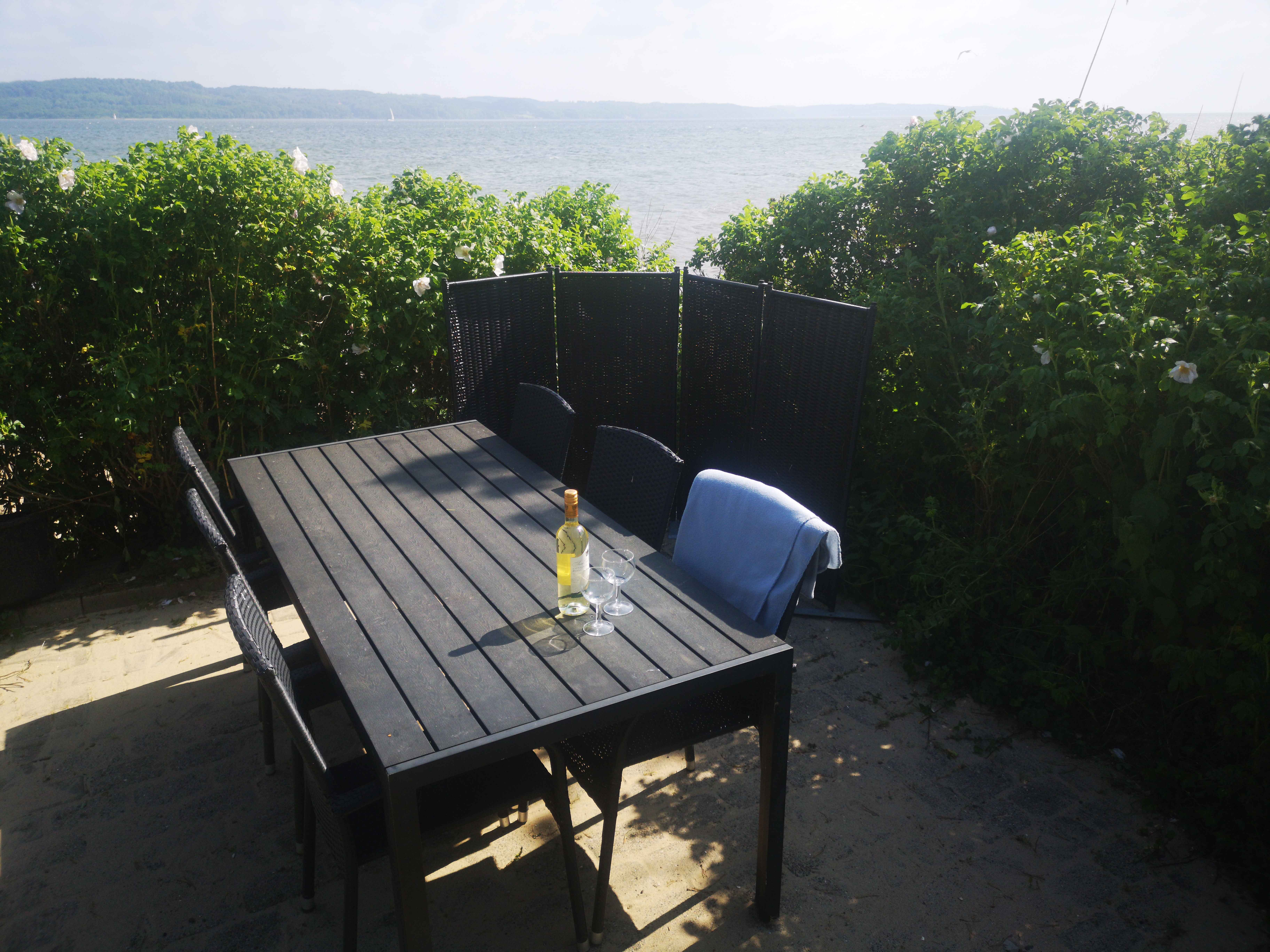Udenfor er der den mest fantastiske, åbne terrasse med havemøbler og med fuld udsigt over strandet og vandet. Der er p-plads til bilen.
