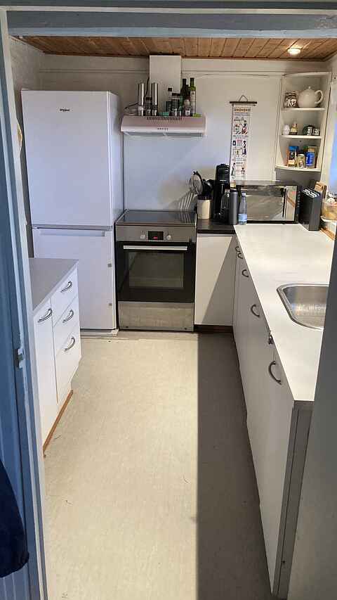 Køkkenet er indrettet med bl.a. mikroovn og miniovn, og her har man den mest fantastiske udsigt over vandet gennem de små, sprossede vinduer. Her kan man geare ned og slappe af, mens man (næsten) nyder at vaske op.