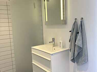 Køkkenet er moderne og fuldt udstyret med alt, hvad du behøver for at tilberede måltider under dit ophold. Det inkluderer en ovn, komfur, mikrobølgeovn, køleskab og opvaskemaskine samt en kaffemaskine og diverse køkkenredskaber. Der er rigeligt med bordplads til at lave mad, og de åbne hylder og skabe giver god opbevaringsplads til dine ingredienser og madvarer.