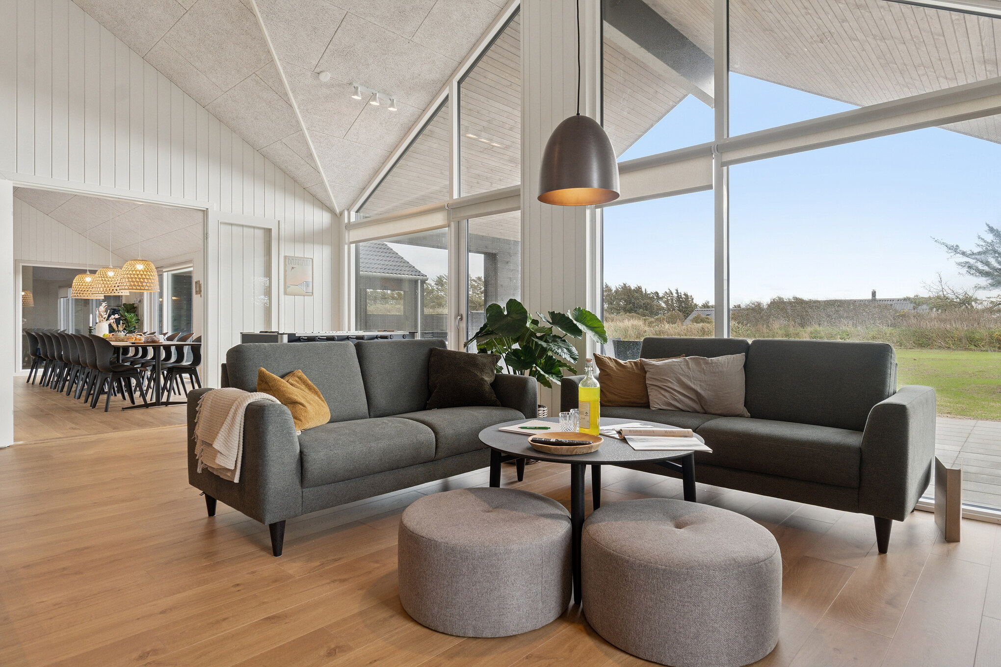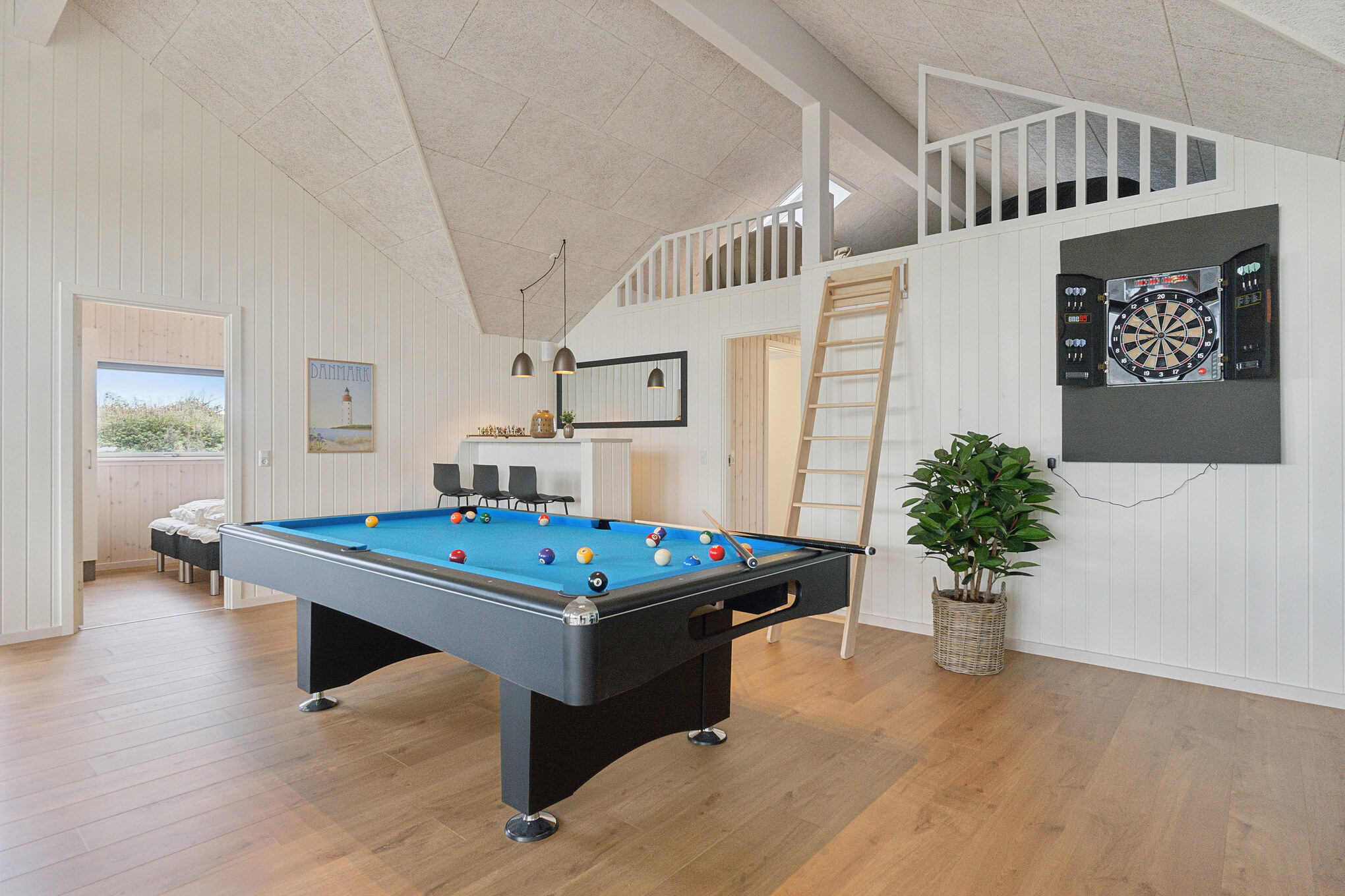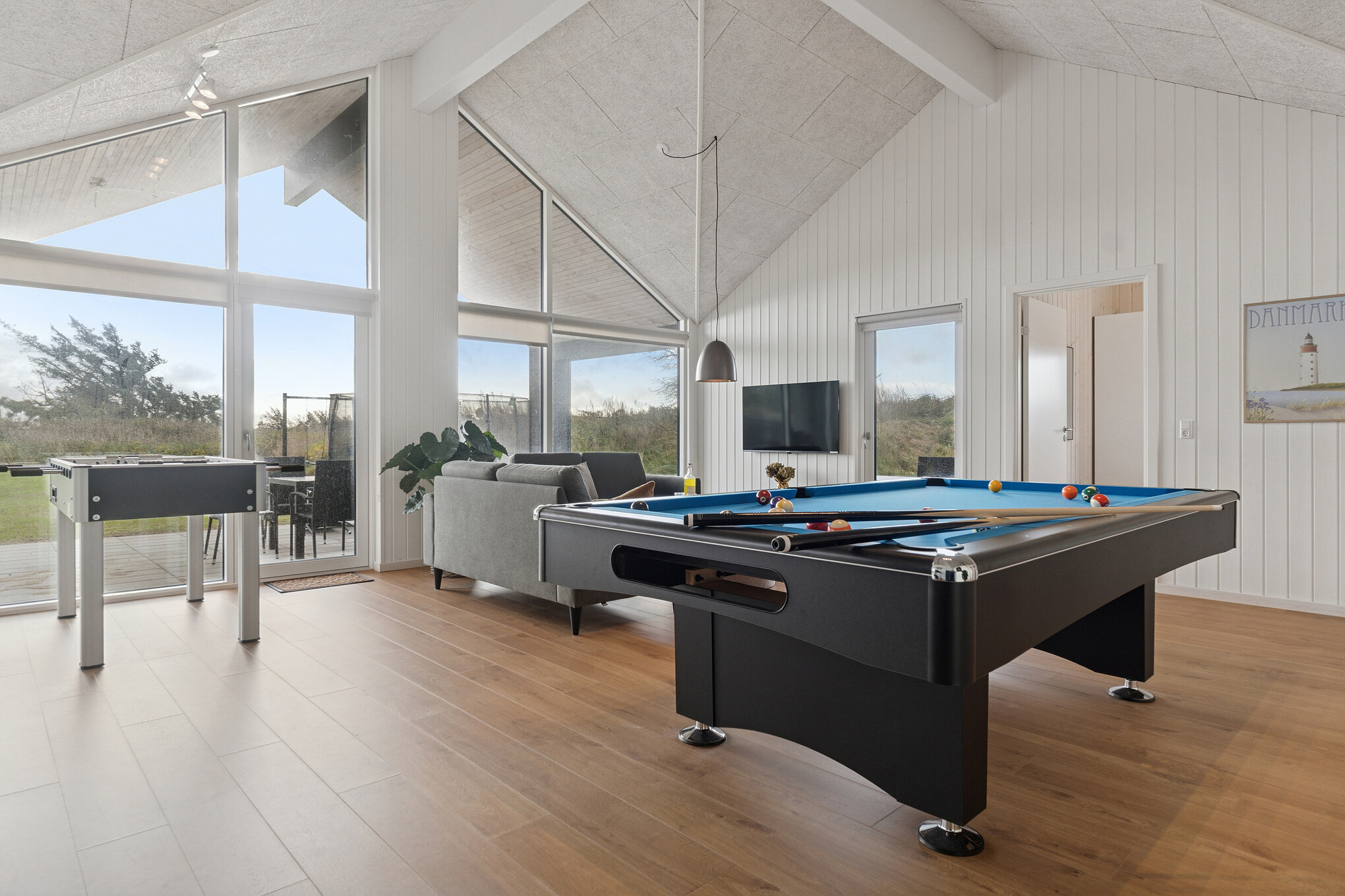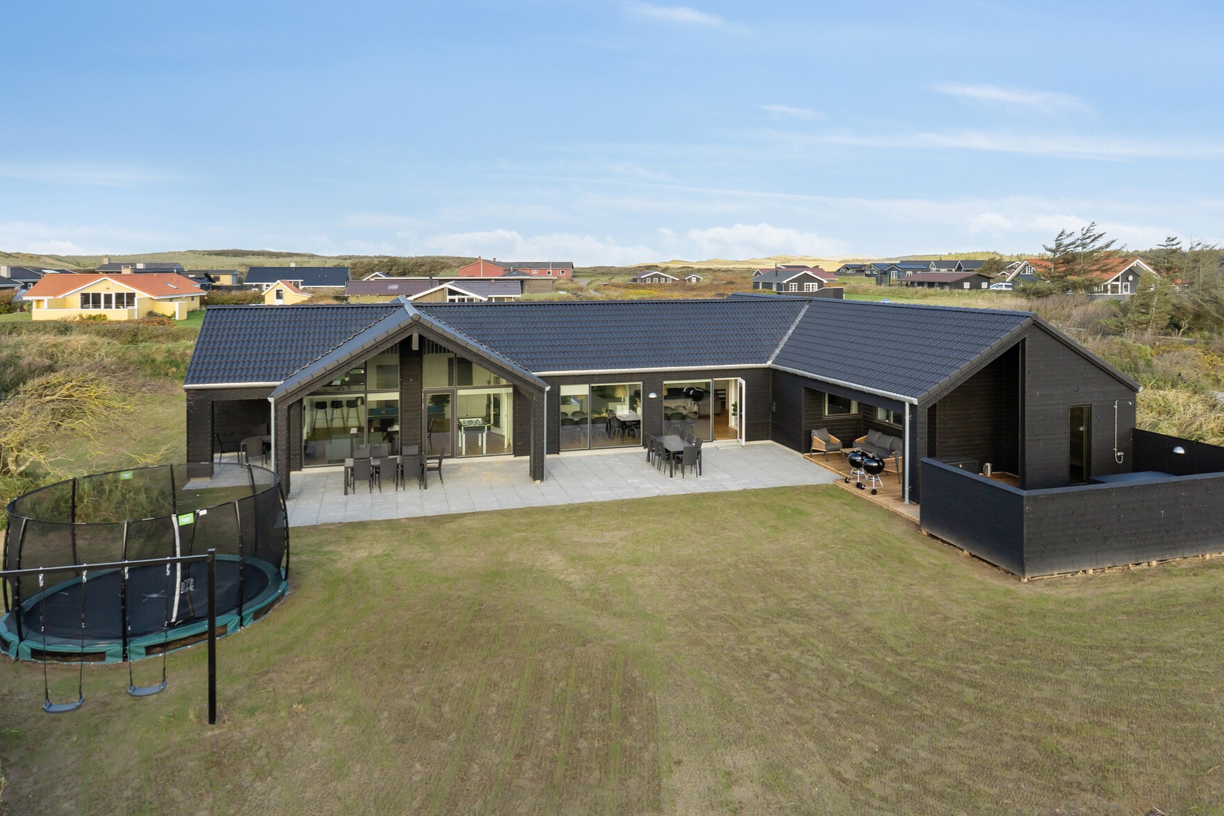 Dette moderne poolhus ved Nr. Lyngby, kun 300 meter fra Vesterhavet, er ideelt til ferie med familie og venner. Huset rummer 18 sovepladser fordelt på 7 værelser og 4 hemsepladser samt 3 badeværelser. Det store fællesrum med XL-køkken og langbord skaber rammerne for samvær og fælles madlavning. Aktivitetsrummet byder på spil og hygge for både børn og voksne, mens poolområdet og wellness-terrassen med udendørs spa og sauna indbyder til afslapning året rundt. Udenfor findes en stor møbleret terrasse, grill, loungemøbler og aktivitetsmuligheder som gynge, trampolin og fodboldmål. Den private grund med udsigt til havet giver plads til både ro og leg.