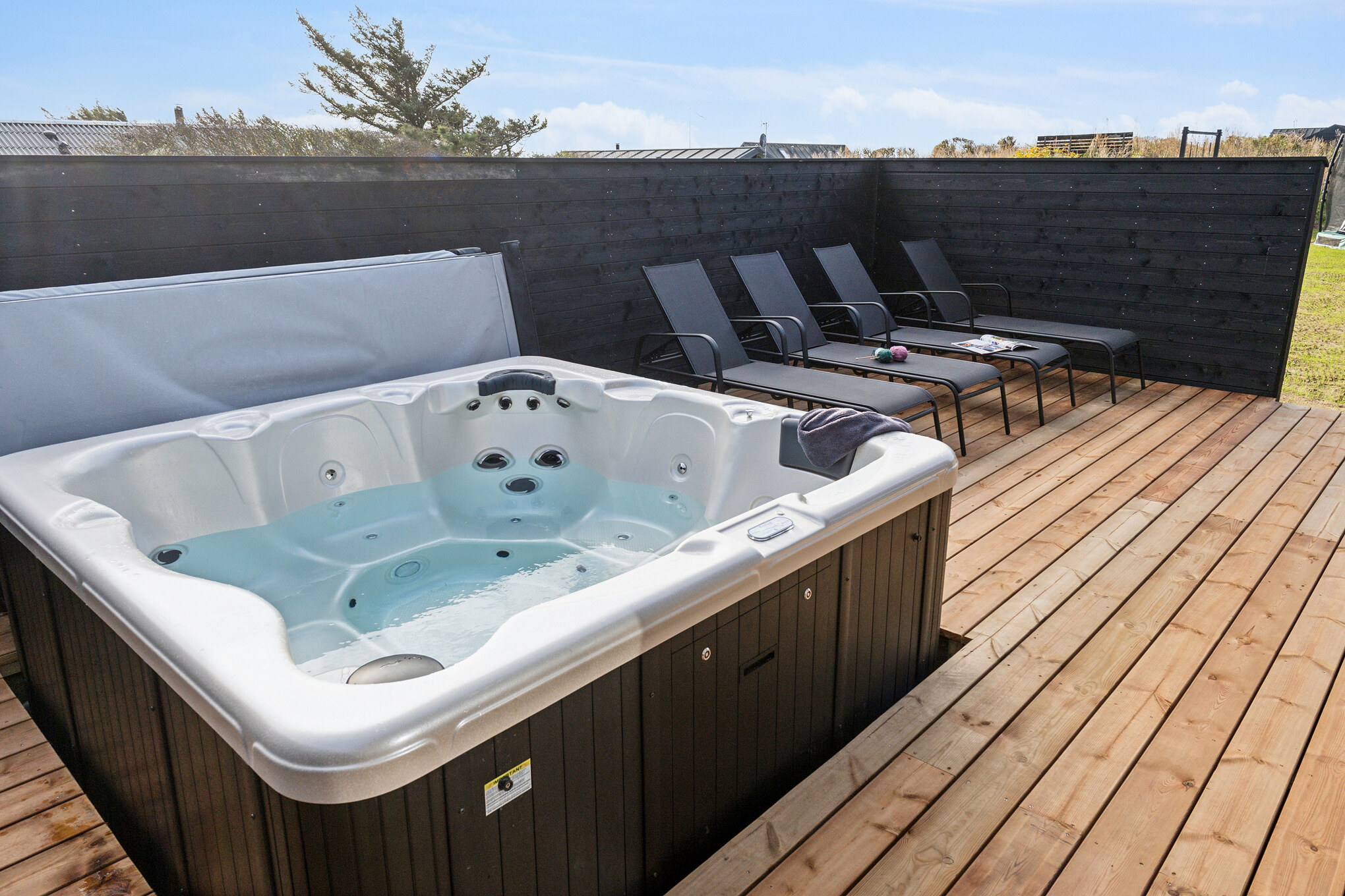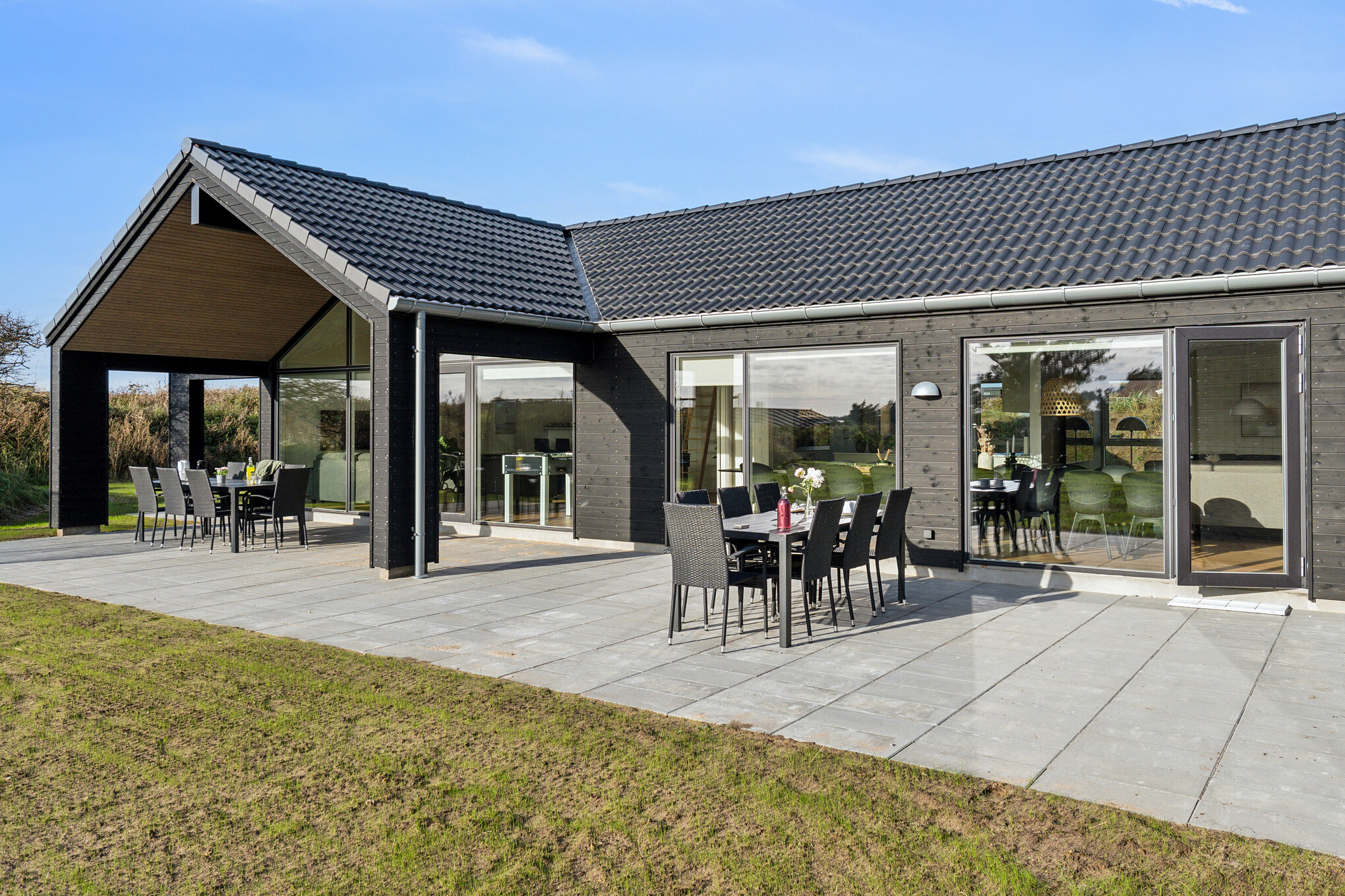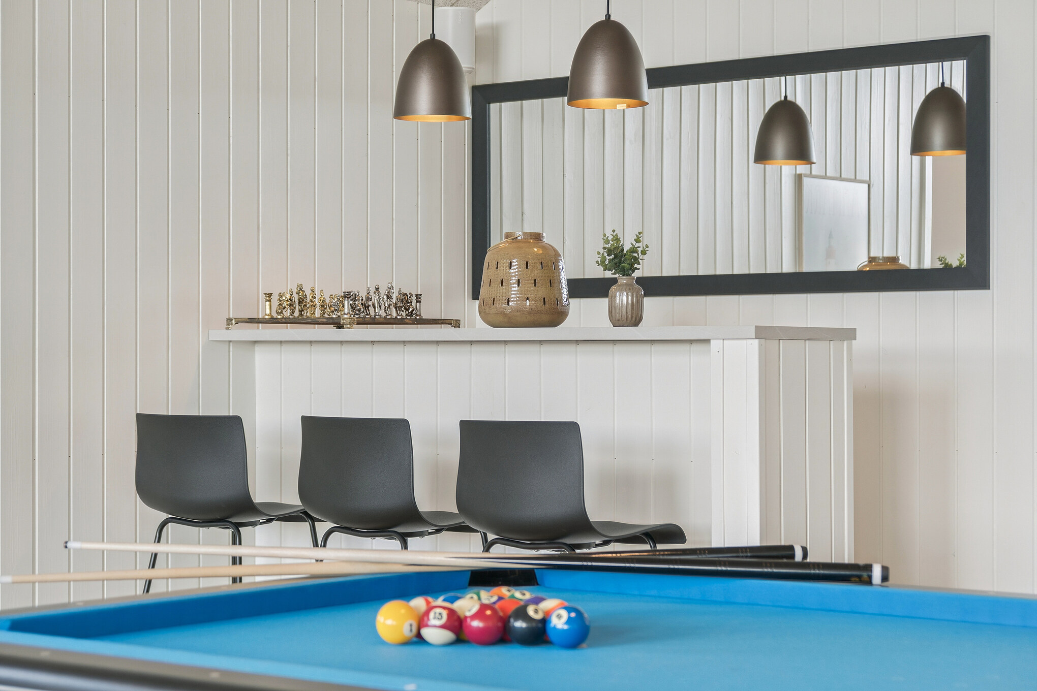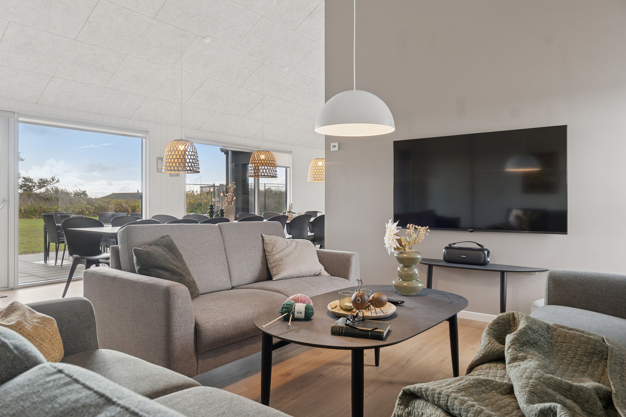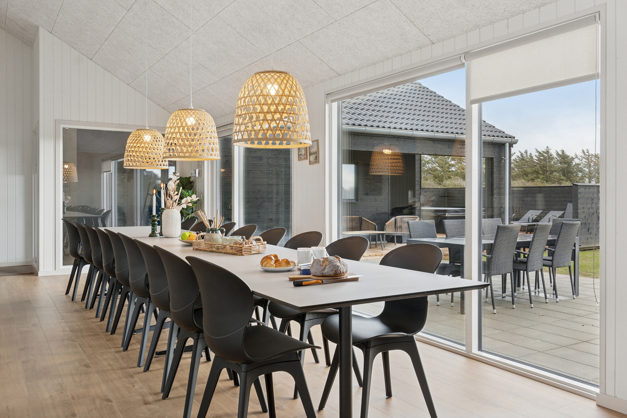 Dette moderne poolhus ved Nr. Lyngby, kun 300 meter fra Vesterhavet, er ideelt til ferie med familie og venner. Huset rummer 18 sovepladser fordelt på 7 værelser og 4 hemsepladser samt 3 badeværelser. Det store fællesrum med XL-køkken og langbord skaber rammerne for samvær og fælles madlavning. Aktivitetsrummet byder på spil og hygge for både børn og voksne, mens poolområdet og wellness-terrassen med udendørs spa og sauna indbyder til afslapning året rundt. Udenfor findes en stor møbleret terrasse, grill, loungemøbler og aktivitetsmuligheder som gynge, trampolin og fodboldmål. Den private grund med udsigt til havet giver plads til både ro og leg.