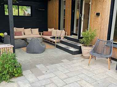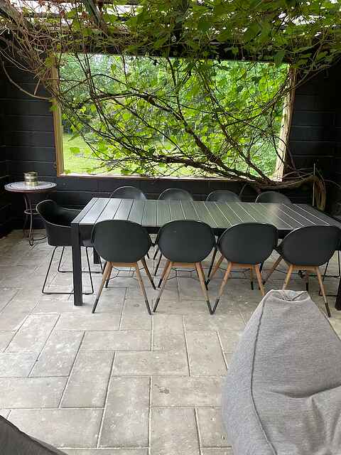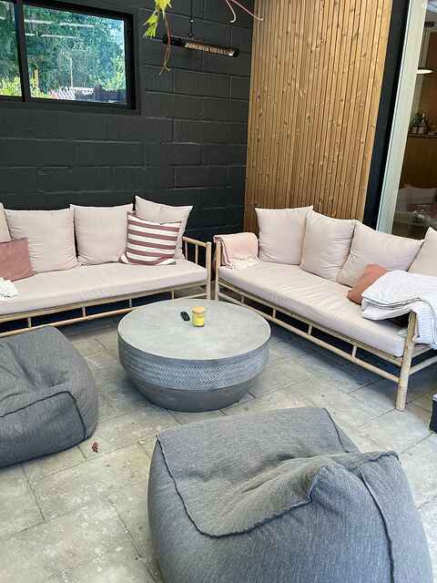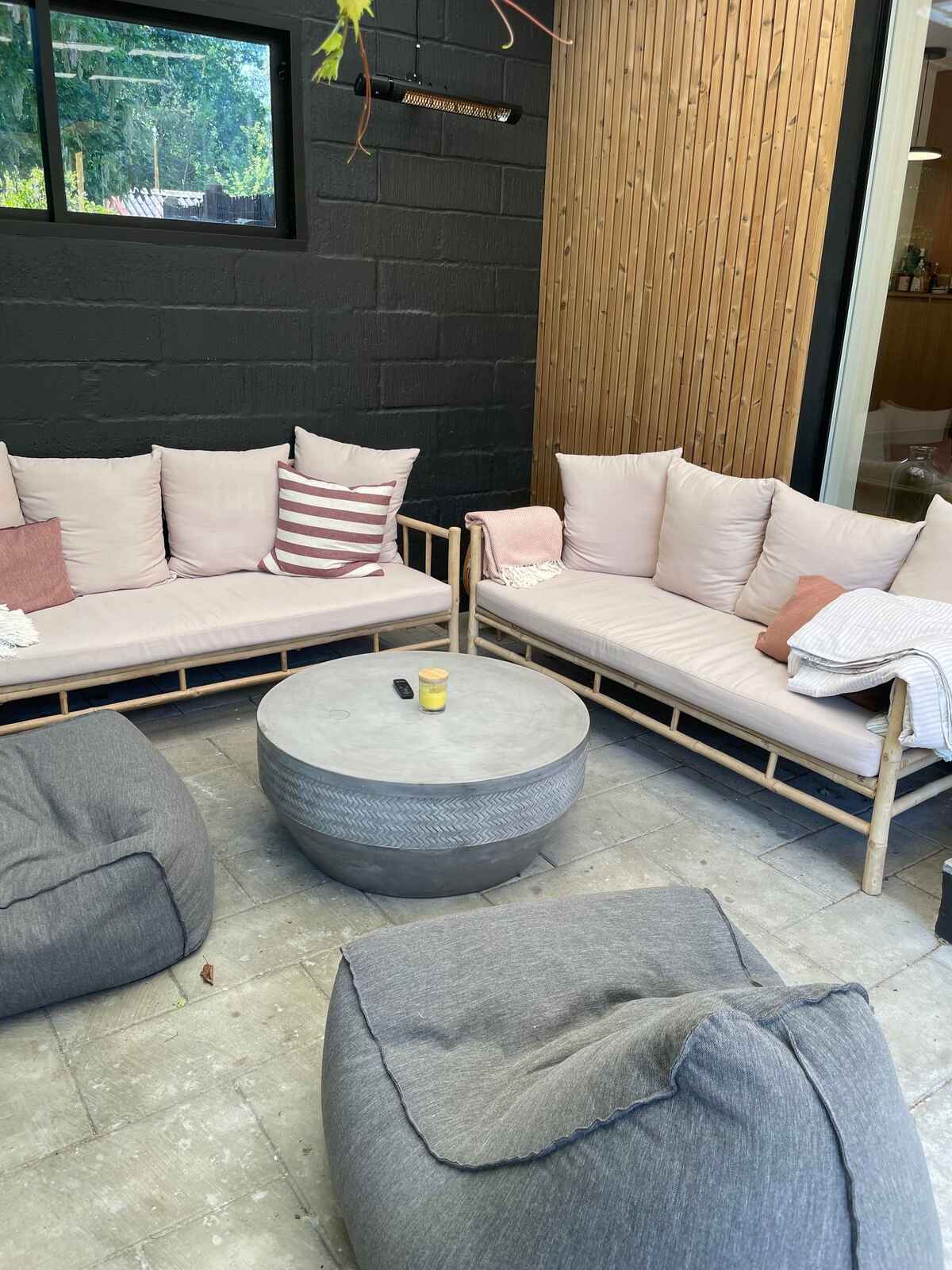 Fantastisk pergola med havebord, loungemøbler og varmelamper.