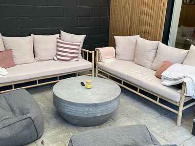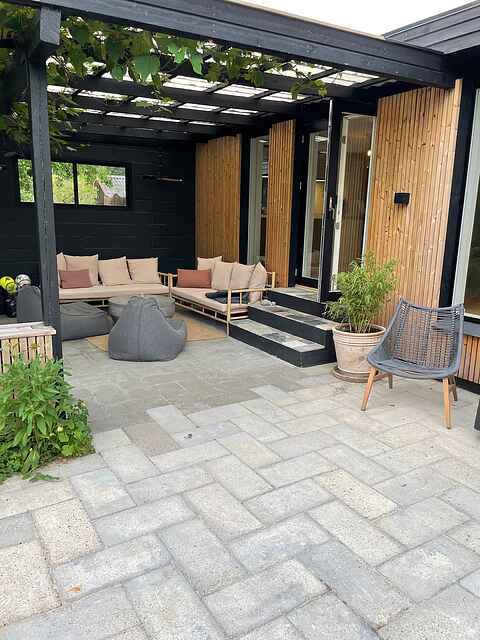 Fantastisk pergola med havebord, loungemøbler og varmelamper.