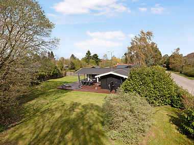 Det sorte træsommerhus med hvide vinduer og døre ligger fuldstændig uforstyrret på en stille vej, hvilket giver en helt særlig ro omkring huset. Her kan I bare være sammen som familie, trække vejret helt ned i maven og nyde ferielivet.