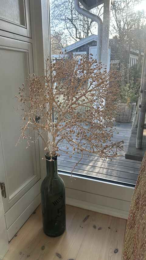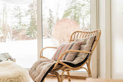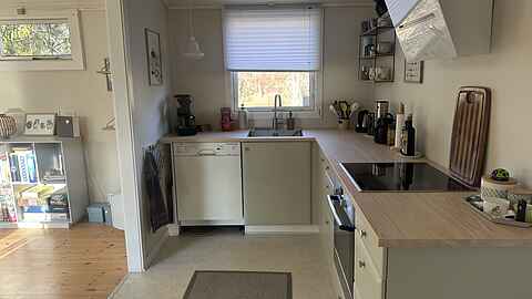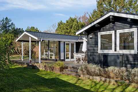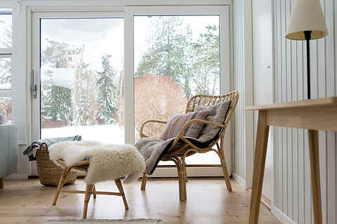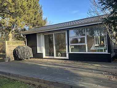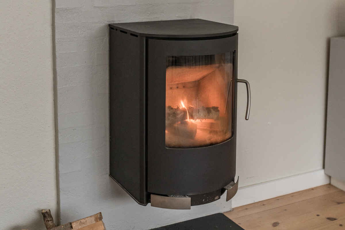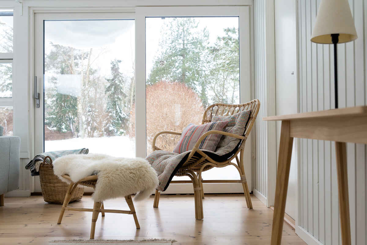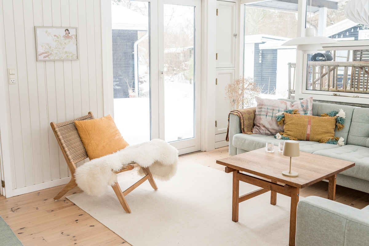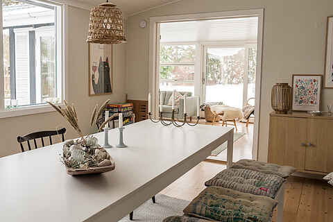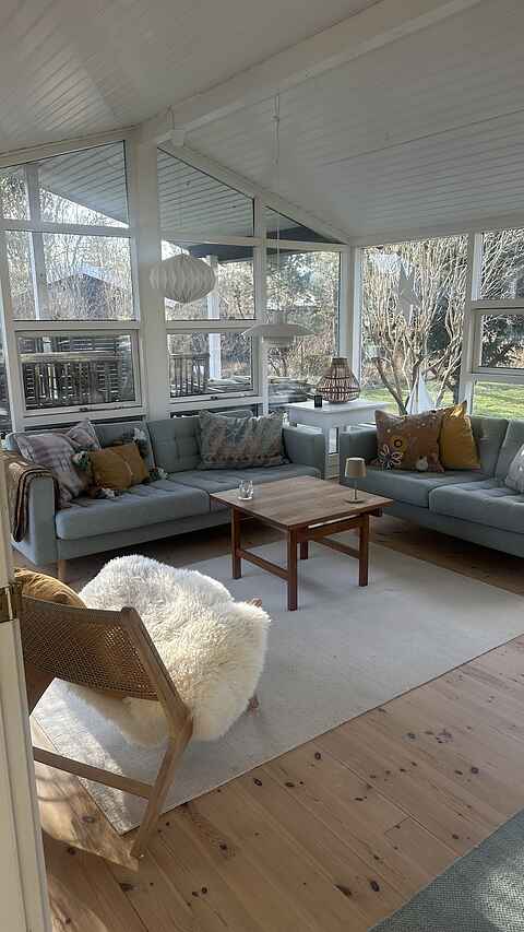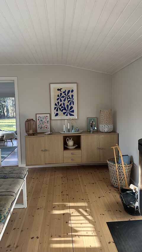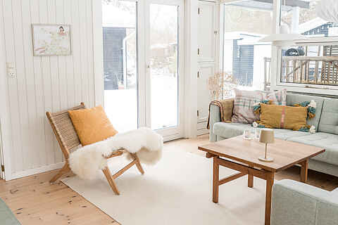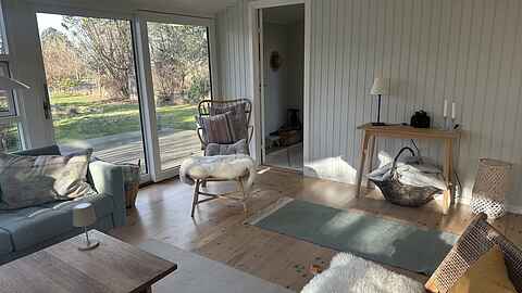 De to lyse stuer har store vinduespartier, brændeovn og direkte udgang til terrassen, hvilket giver en afslappet feriestemning hele året.