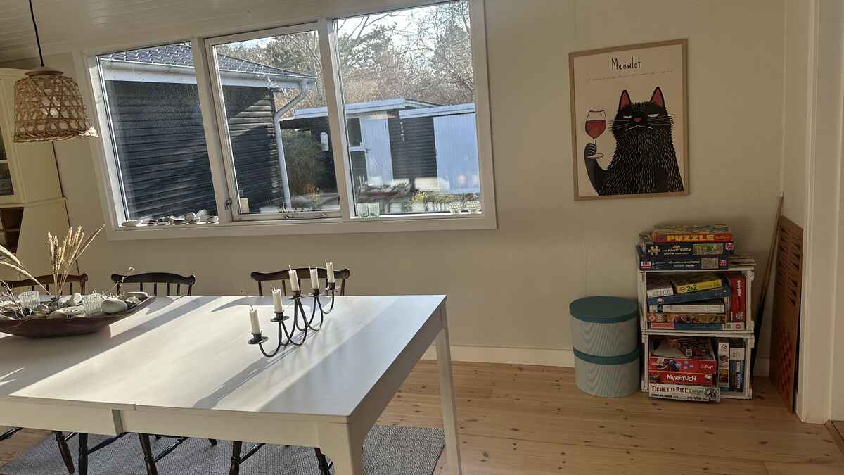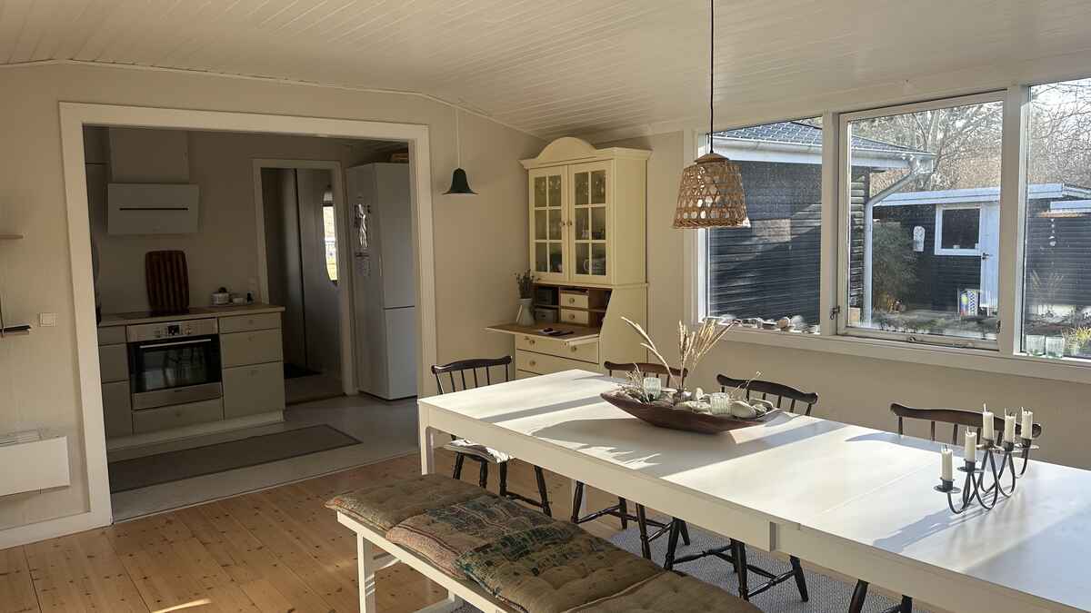 Huset ligger kun 200 meter fra en bred og børnevenlig strand, hvor I kan bade, sole, samle sten og gå lange ture langs kysten.