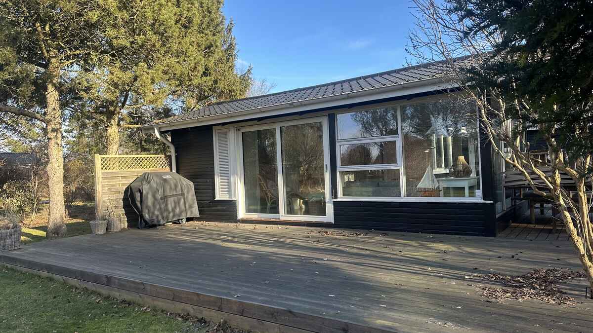 De to lyse stuer har store vinduespartier, brændeovn og direkte udgang til terrassen, hvilket giver en afslappet feriestemning hele året.