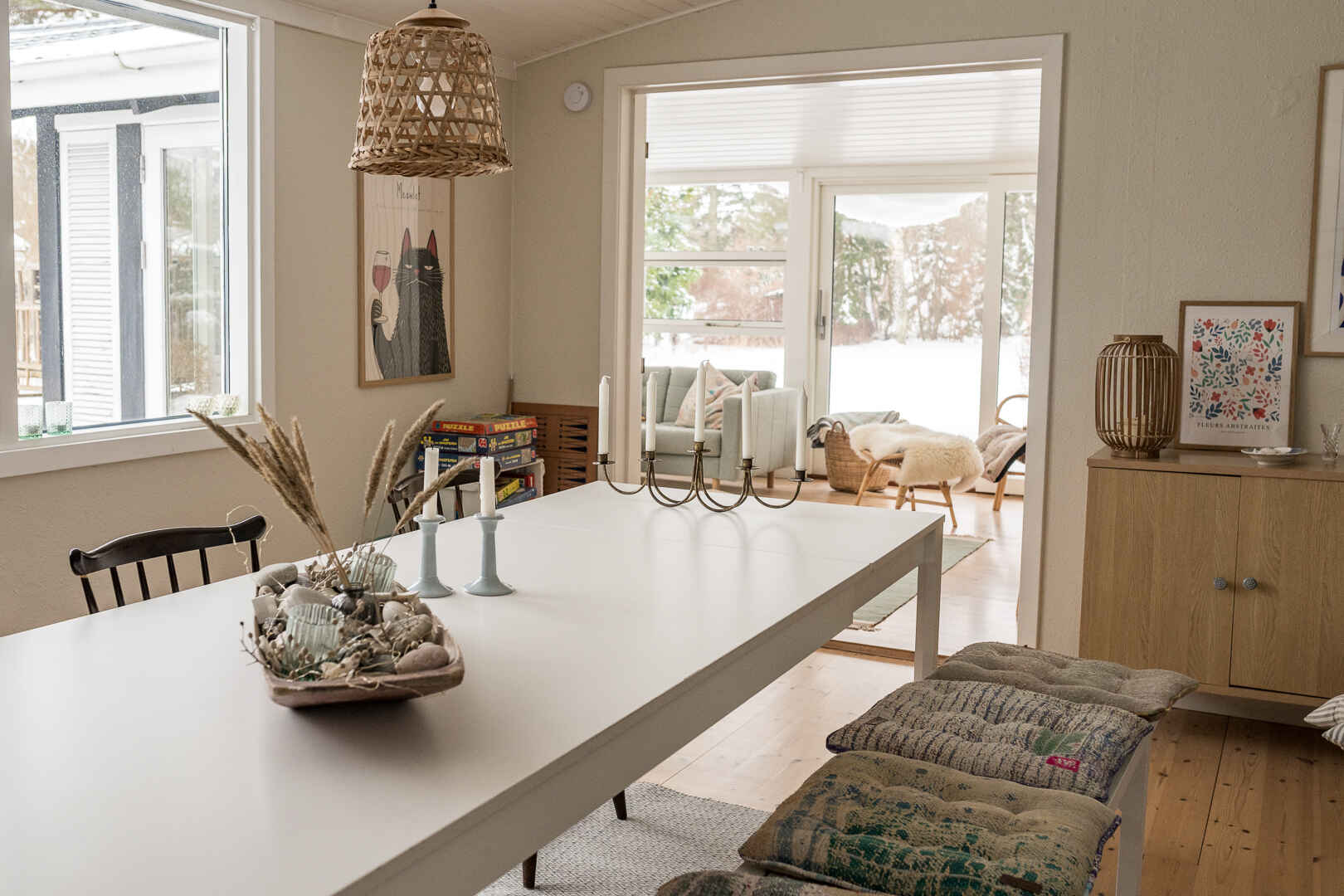 Sommerhuset rummer 8 sovepladser fordelt på tre værelser i hovedhuset og et hyggeligt anneks med dobbeltseng – ideelt for familier eller vennegrupper, der rejser sammen.