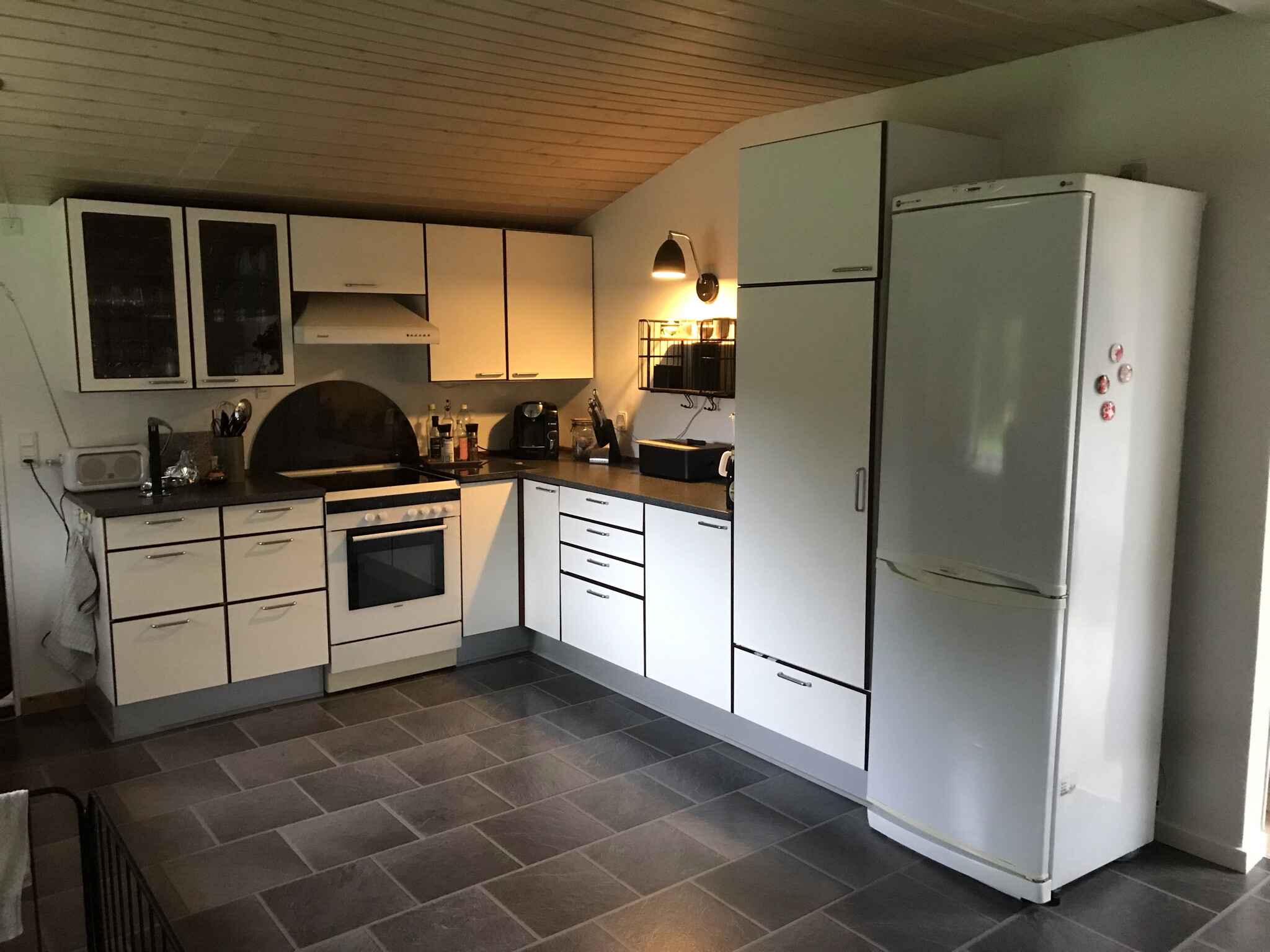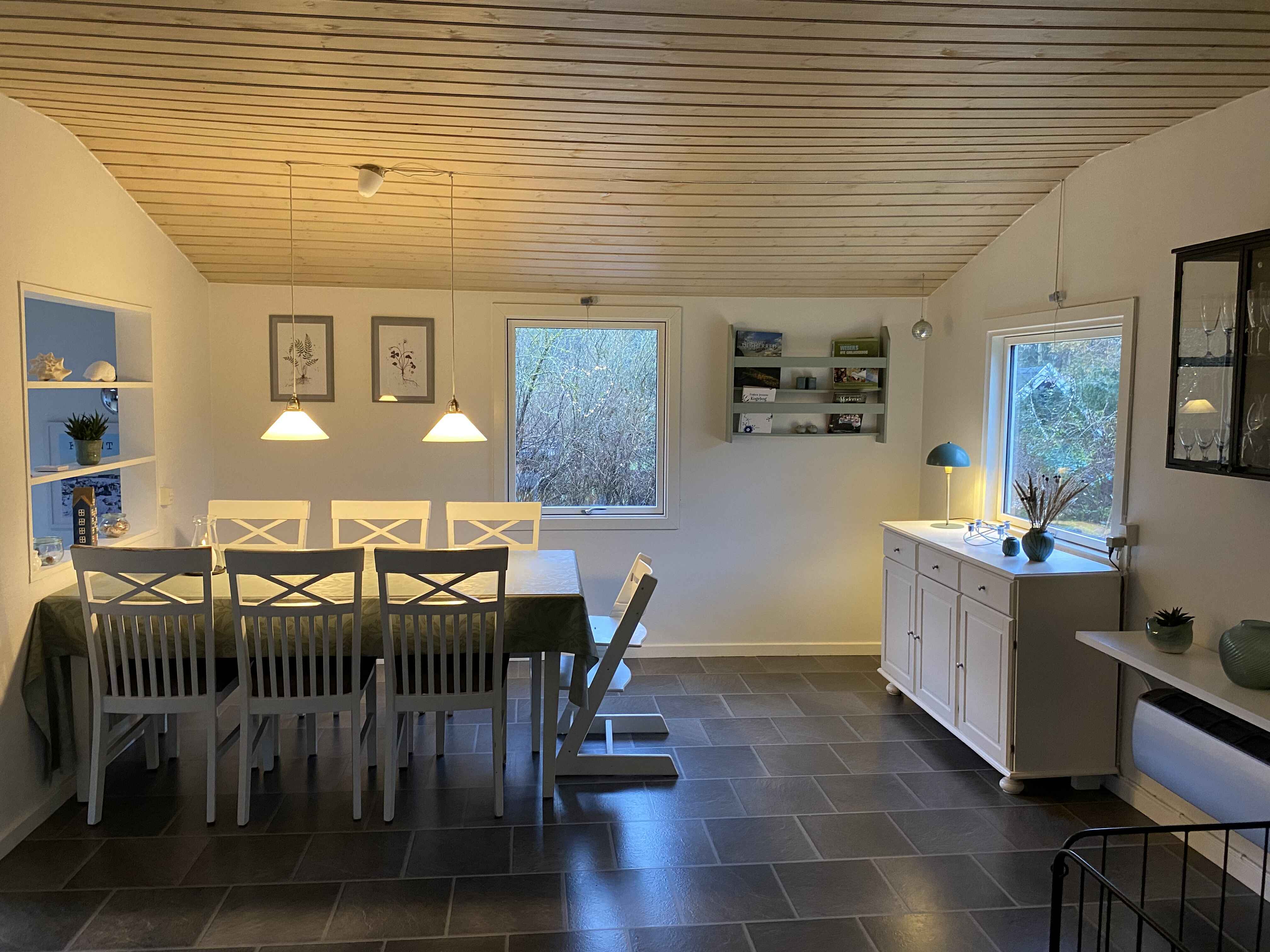 Stuen er hyggeligt indrettet. Her er tv-pakke, og Cromecast, herudover er der tysk parabol tv. Der findes rejseseng, 1 babyhøjstol,2 børnestole, babybadekar, puslebord og klapvogn. Ude findes både kul- og gasgrill.