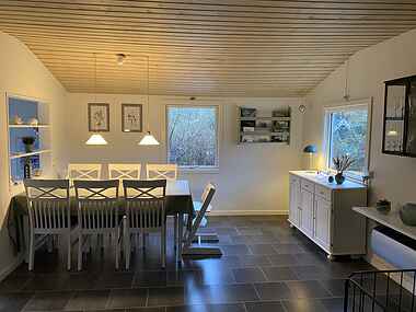 Renoveret sommerhus beliggende 1000 m fra strand i ældre sommerhusområde, andensidst på blind stille vej,langt fra trafikstøj. Haven er 1500m2 stor med 2 terrasser, en delvis overdækket med pavillon. Her befinder sig bålplads med bålstativ, gynger, sandkasse og trampolin. Huset er hyggeligt indrettet med to soverum. En med stor dobbeltseng, andet med mindre dobbeltseng 200 x 160 og køjeseng til to mindre børn.(Max 10-12 år) Stort køkkenalrum med brændeovn, varmepumpe, opvaskemaskine og vaskemaskine. Siddeplads til 8. Større bad med gulvvarme.