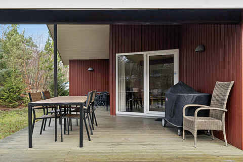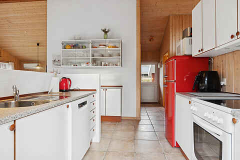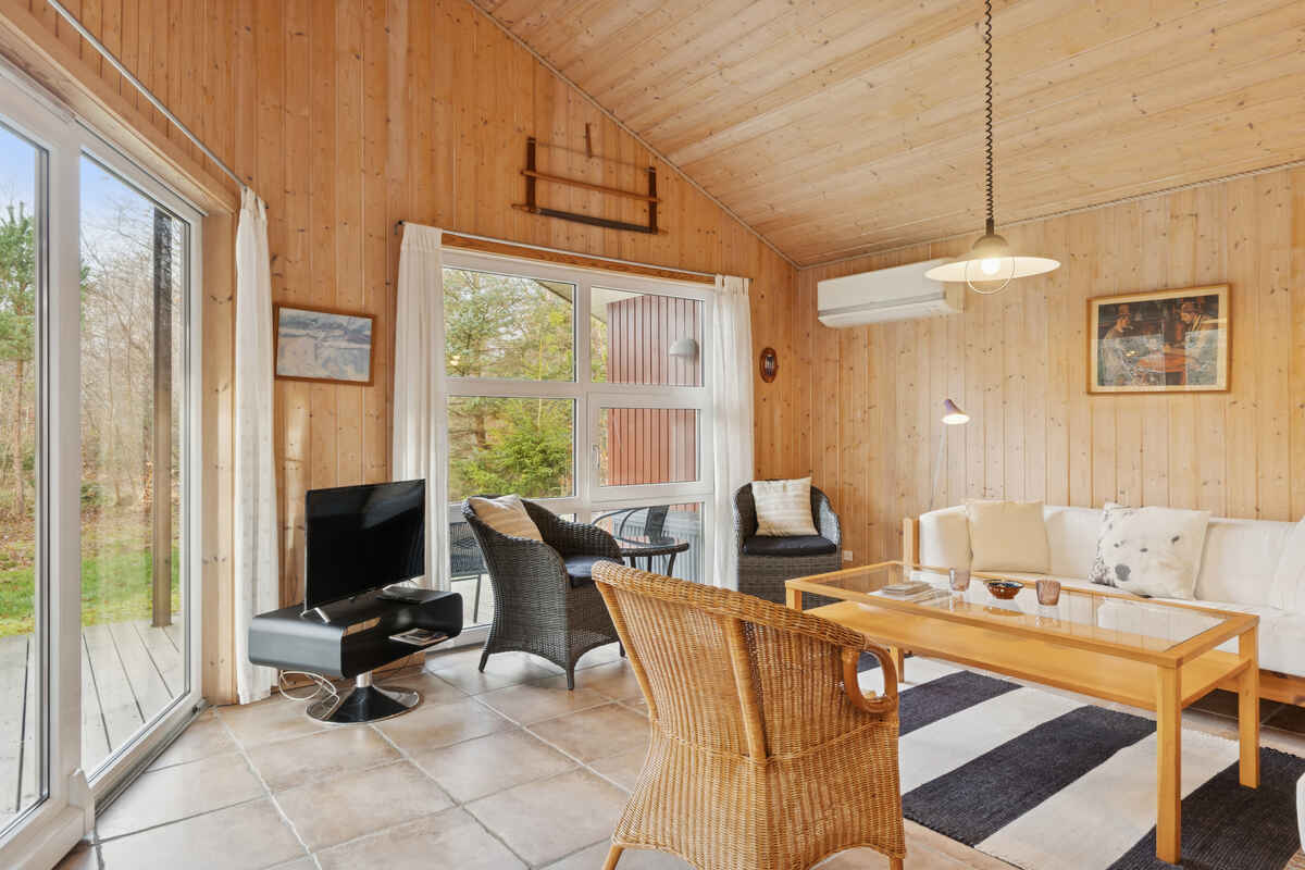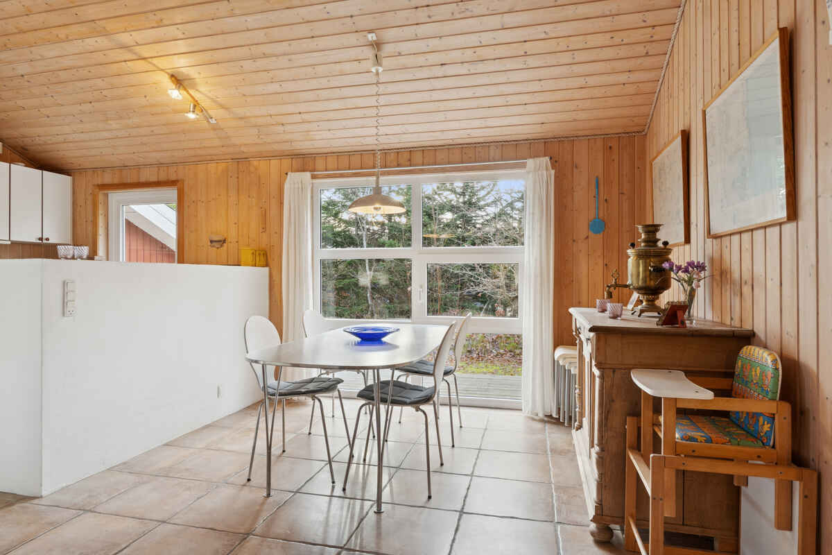 Indenfor venter en lys stue i åben forbindelse med køkkenet. Herfra er der direkte udgang til en delvist overdækket terrasse, hvor dagens måltider kan nydes i læ og med udsigt til den ugenerte have.