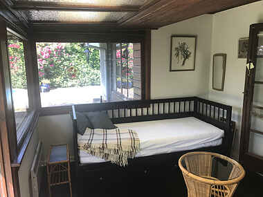 Huset har tre soveværelser. To af soveværelserne en indrettede med dobbeltsenge. Det tredje soveværelse har to enkeltsenge og fungerer også som et gennemgangsværelse. Det har ikke dør, men er afskærmet med et fletgardin. Derudover er der en sovesofa med plads til to personer. Sovesofaen står i den skønne udestue, der har dobbelte døre ud til haven og udsigt til den fantastiske, store rhododendron.