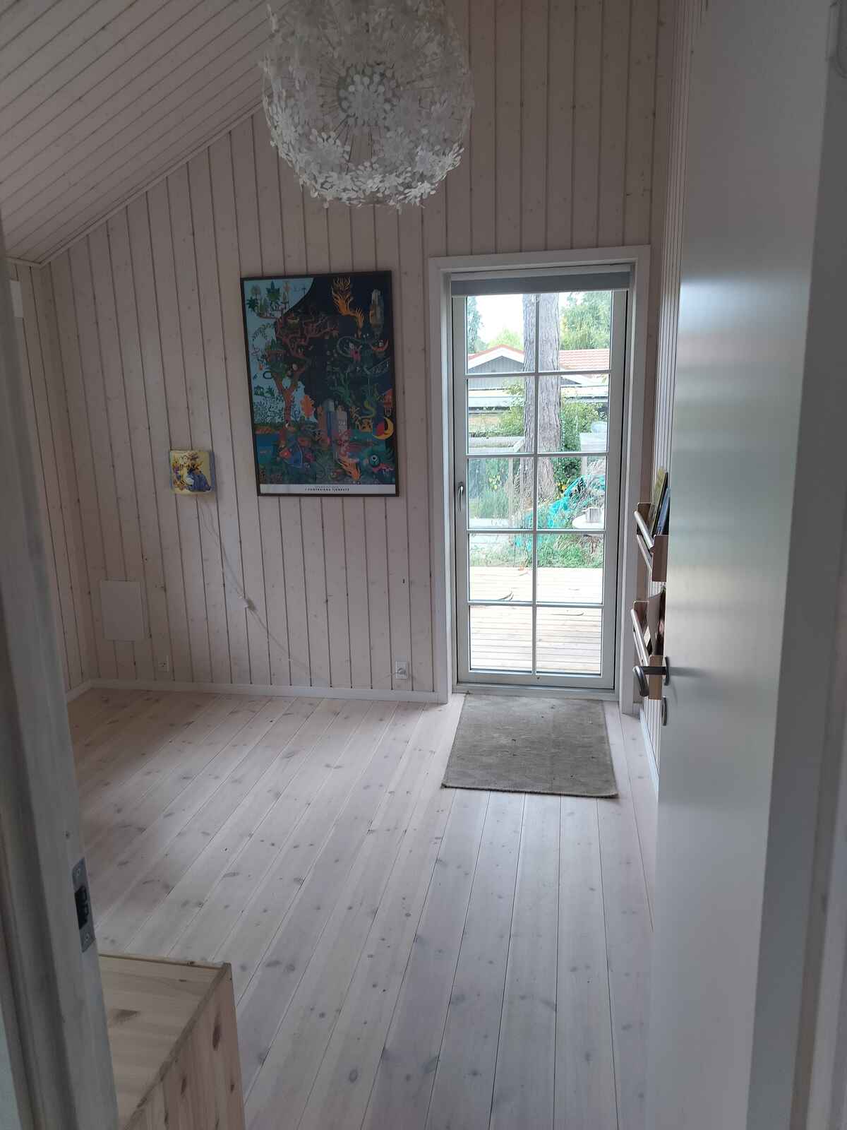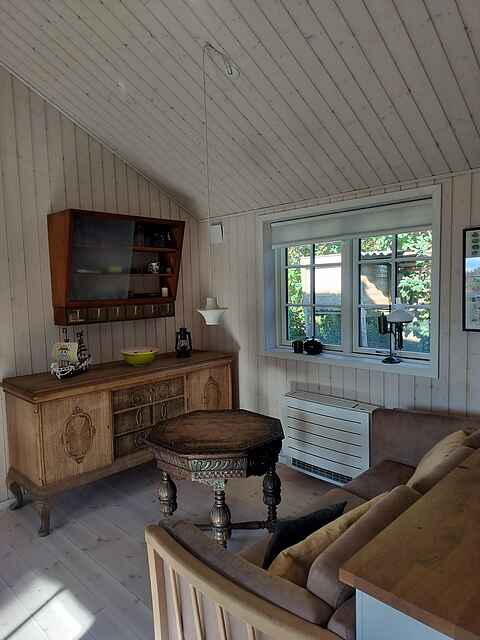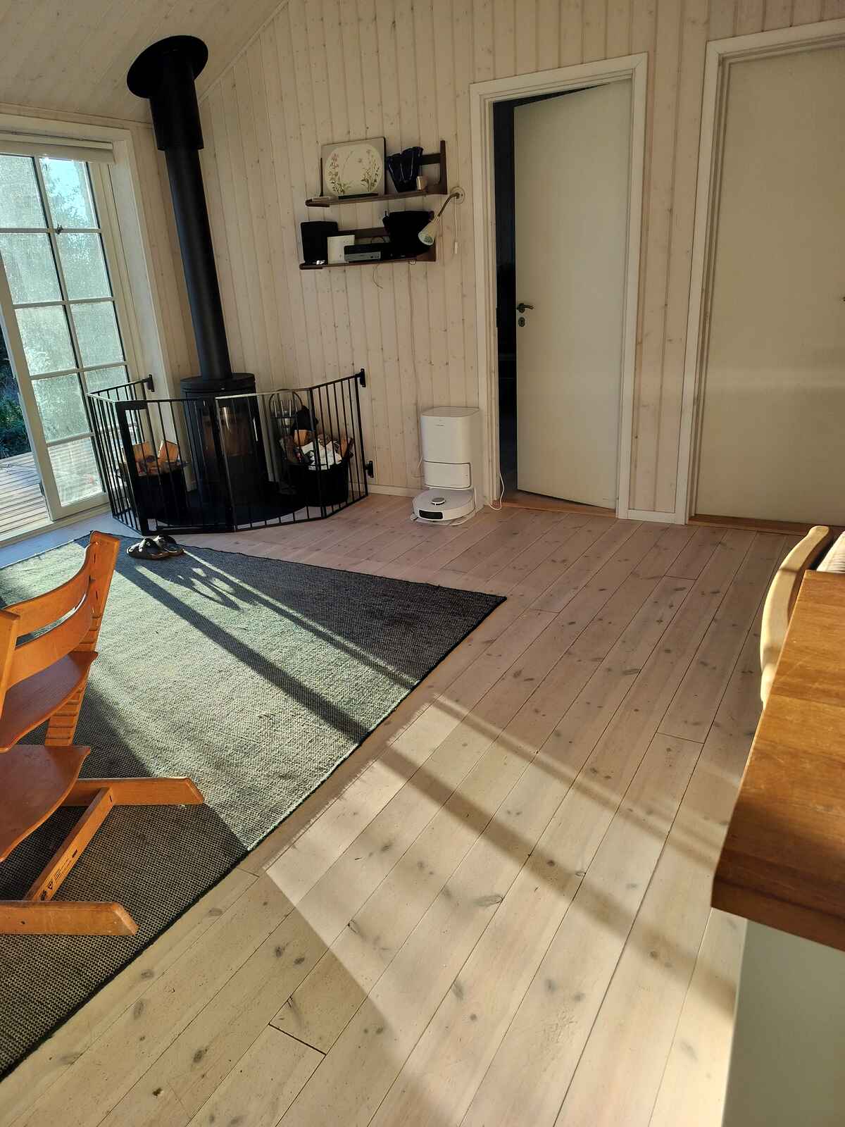 Indenfor er der højt til loftet, 3 gode værelser, stort køkken alrum, et dejligt badeværelse med bruser, gulvvarme og vaskemaskine. Når I sidder ved spisebordet er der det mest fantastiske lysindfald og det er også herfra muligt at spotte fjorden.
