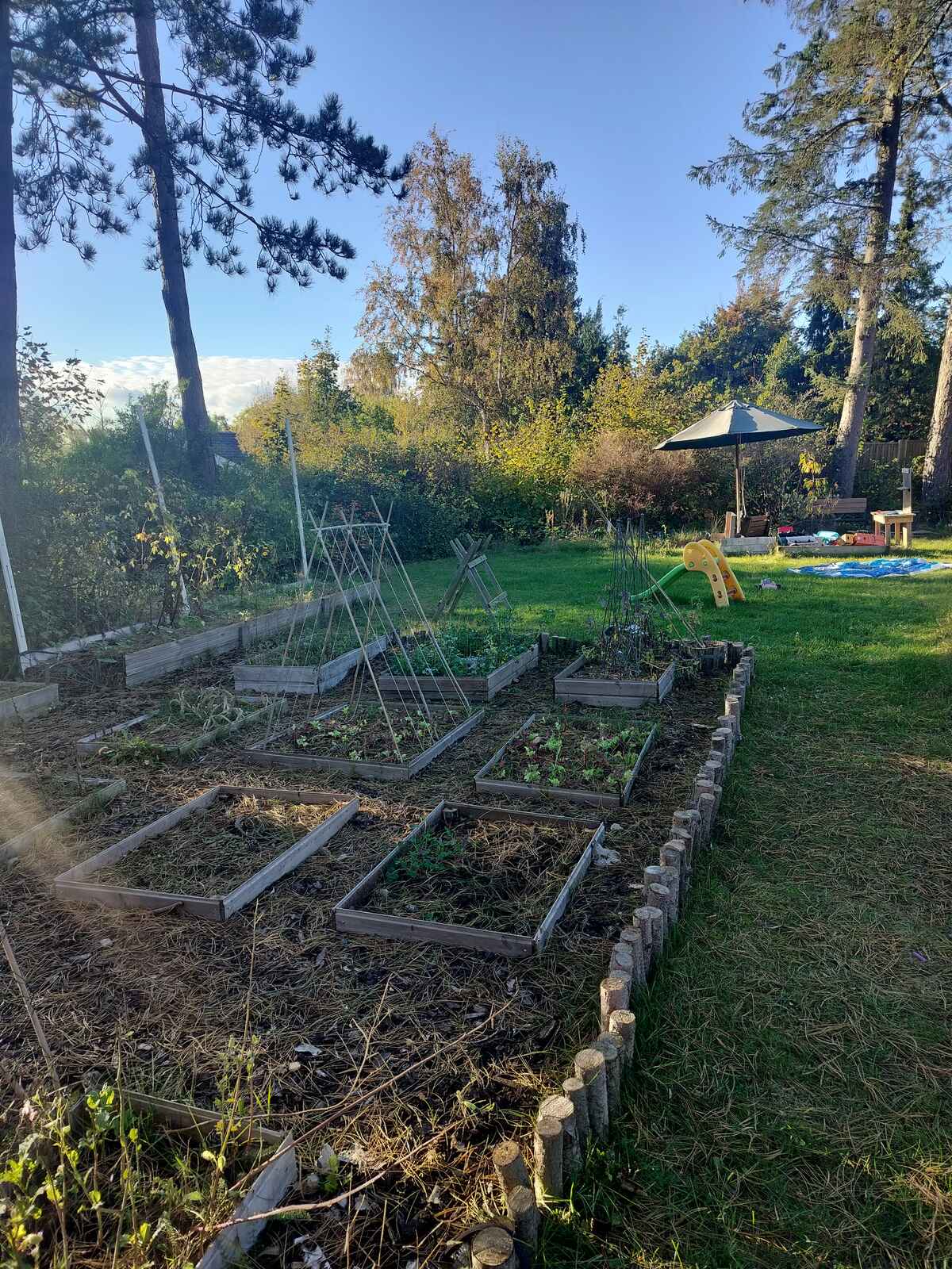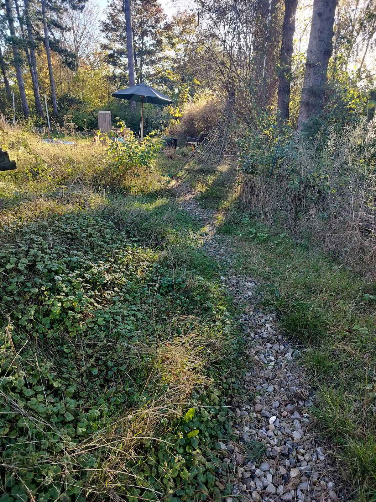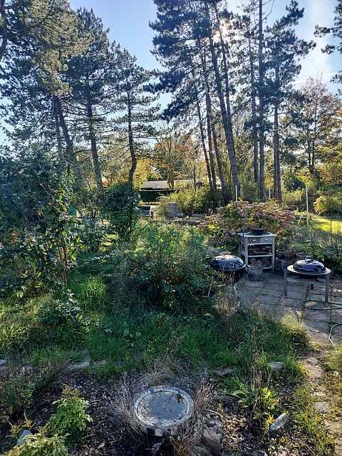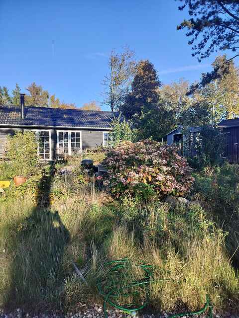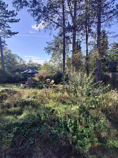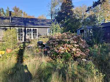 Haven er vild og frodig, og ofte besøgt af vores egern og spætter der holder til i fyrretræerne, og sidder I stille i meget mere end 5 minutter vil sommerfugle, andre insekter og fugle sværme omkring jer. Dette er en rigtig god grund til naturelskeren.