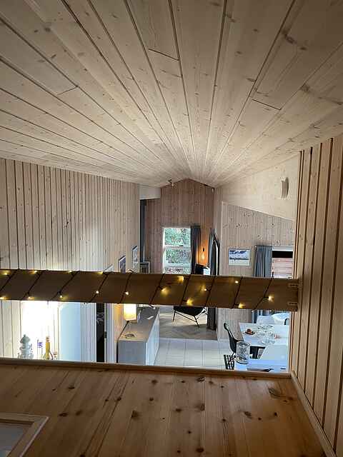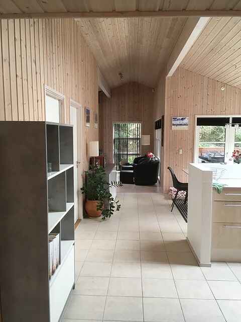 Huset indeholder alt, hvad der er brug for til en rigtig god ferie. Her er en dejlig, lys opholdsstue med åbent køkken – adskilt fra stuen med en halvmur. På denne måde kan hele familien hygge sig sammen, også selv om alle ikke er i køkkenet.