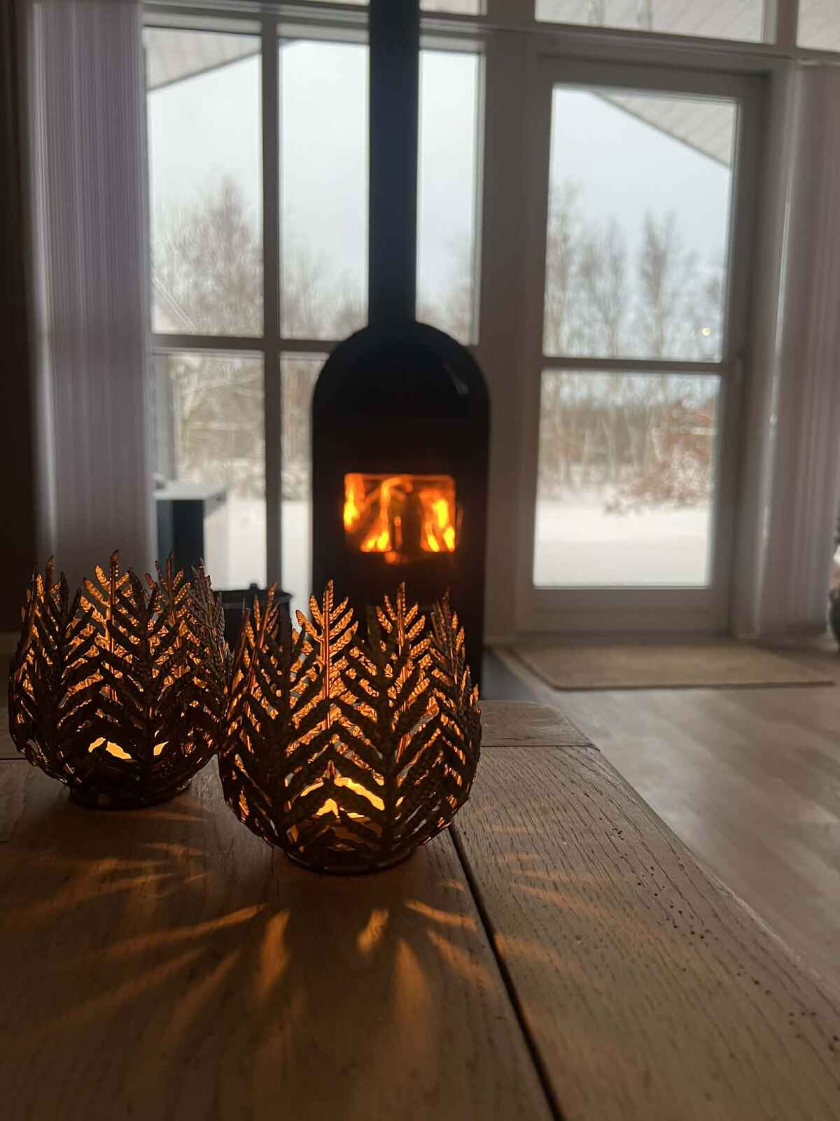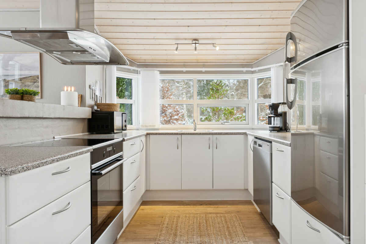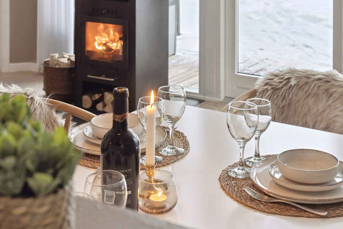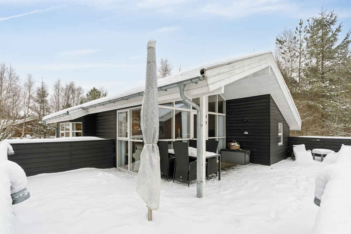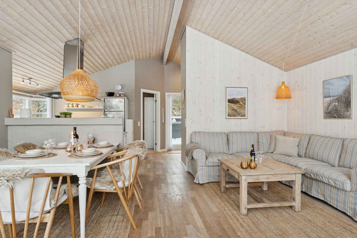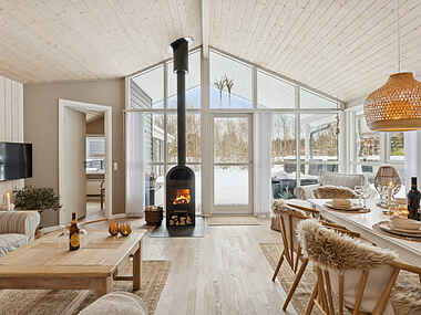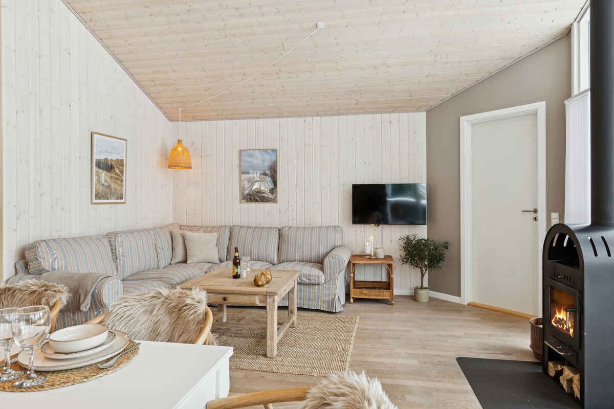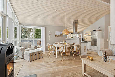 Opholdsrummet samler huset og indbyder til samvær. Her giver brændeovnen ekstra hygge på kølige dage, mens den overdækkede træterrasse forlænger udelivet og gør det let at nyde måltider og rolige stunder i læ.