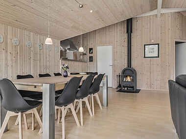 Huset har en hyggelig stue med et flot, stort vinduesparti, der giver masser af lys. Stuen er indrettet med et dejligt sofahjørne, hvorfra I kan nyde udsigten over grunden. Her er brændeovn og TV med Chromecast. Huset har varmepumpe. I stuen er der også et dejligt, stort spisebord med plads til hele selskabet.