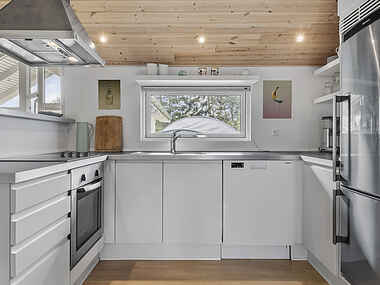 Køkkenet er velindrettet og veludstyret og ligger i åben forbindelse med stuen. Her er selvfølgelig opvaskemaskine. Ved køkkenet er der en bardisk med høje stole, så ”køkkenskriverne” kan være med, når kokken arbejder. Fra køkkenet er der en stige op til hemsen, hvor der er indrettet 2 sovepladser/madrasser til børn.
