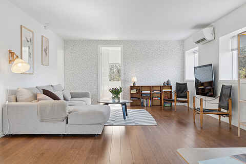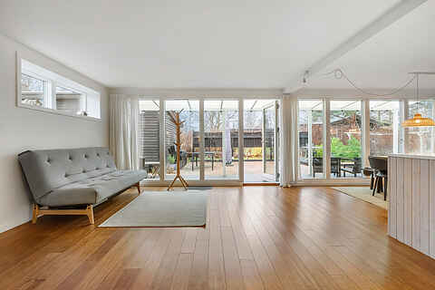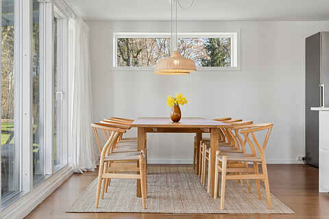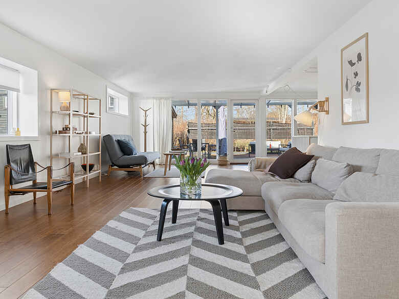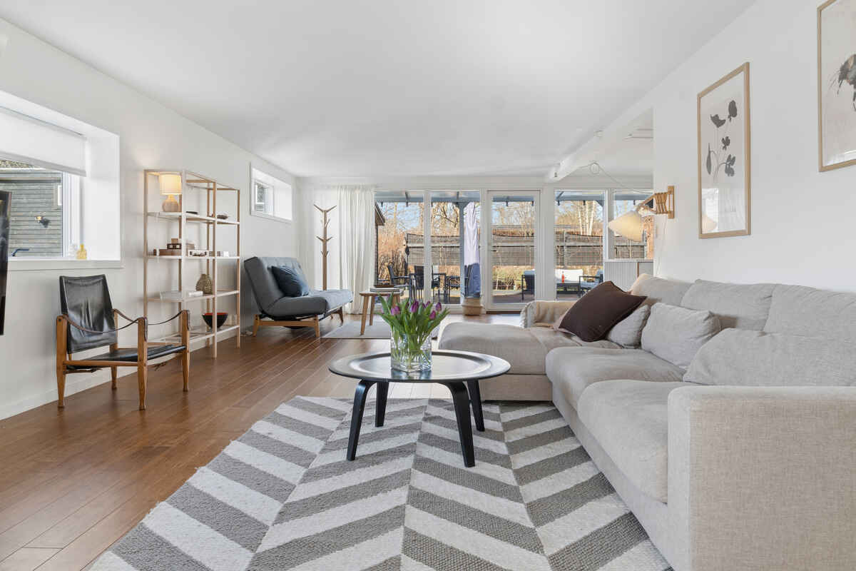 De store vinduespartier og terrassedøre sikrer et dejligt lysindfald og skaber en fin forbindelse mellem inde og ude.